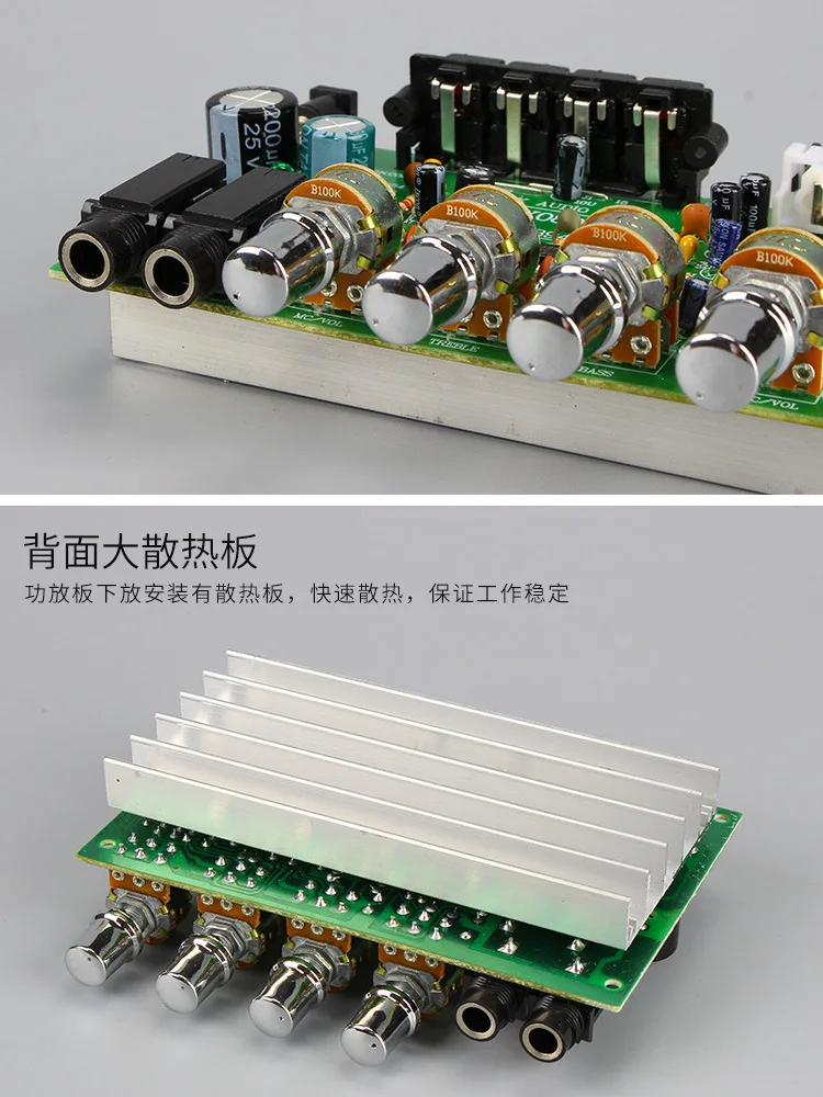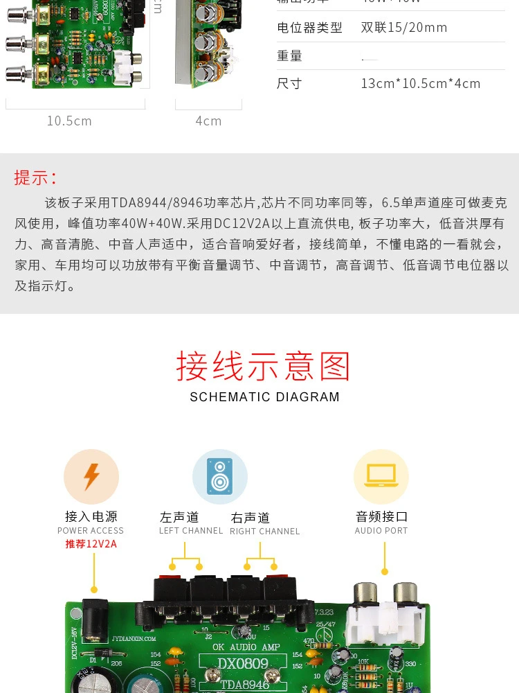Эта плата использует TDA8944 мощность чип, 6,5 подойдет как для повседневной носки, так розетка переменного тока, номинальная мощность 15 Вт × 2.