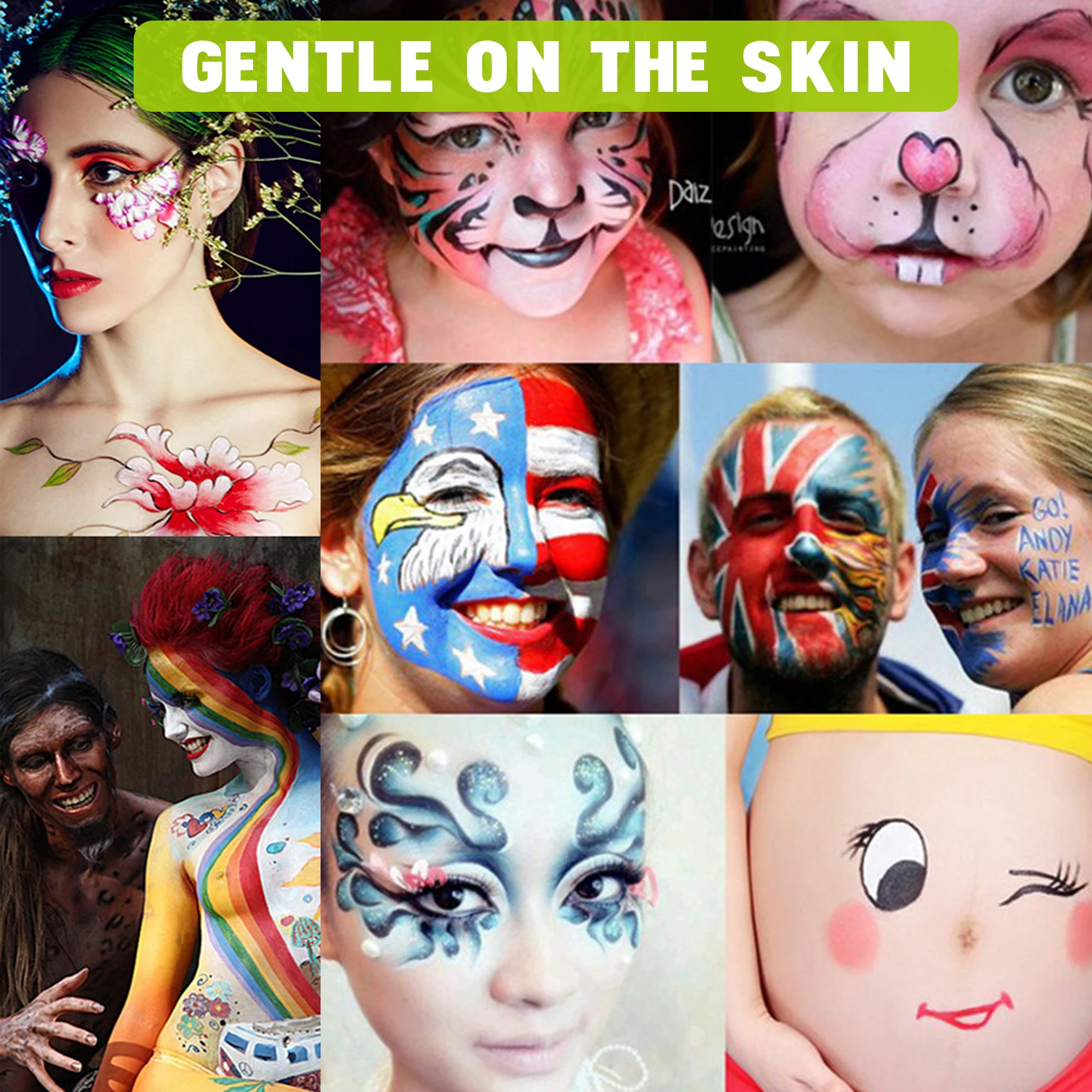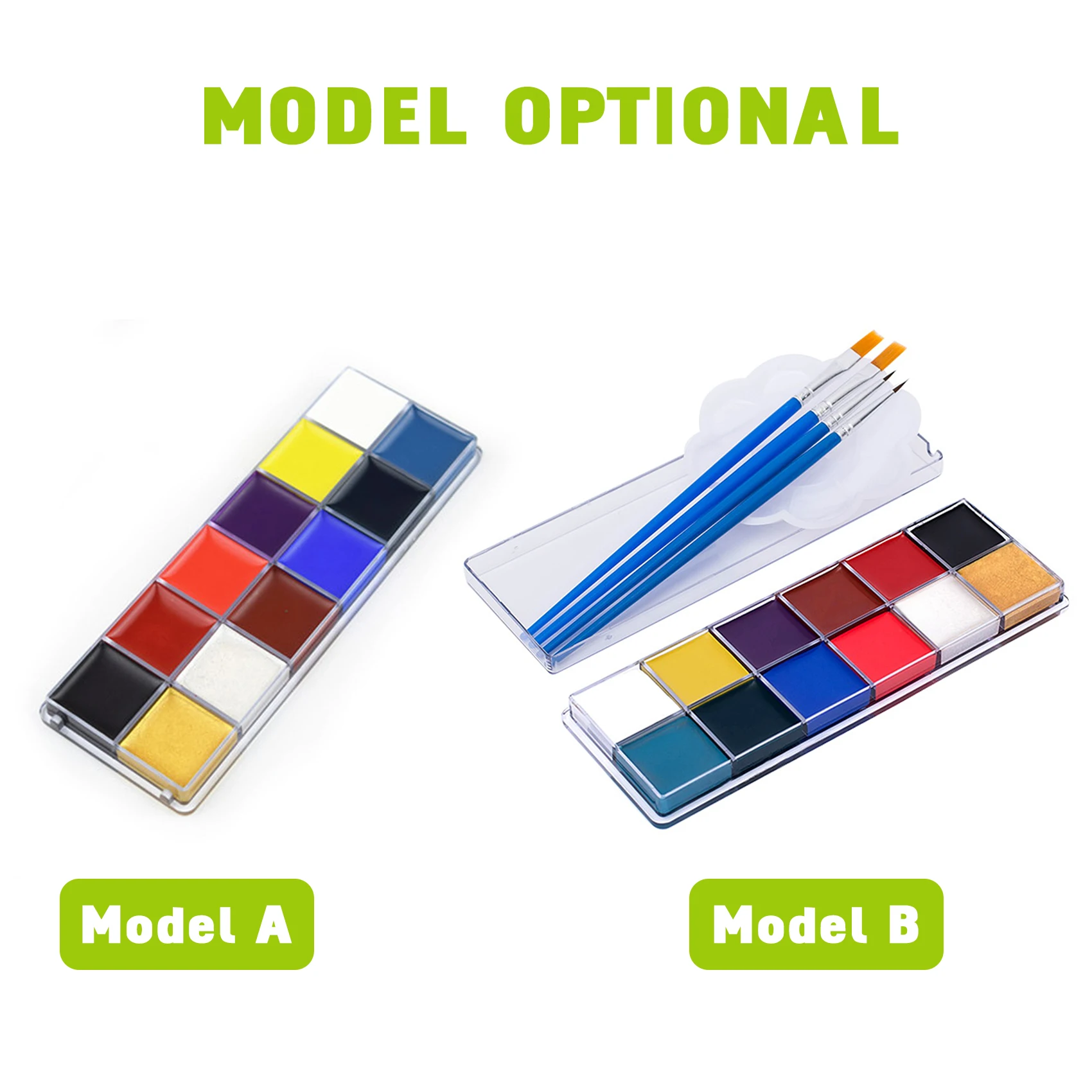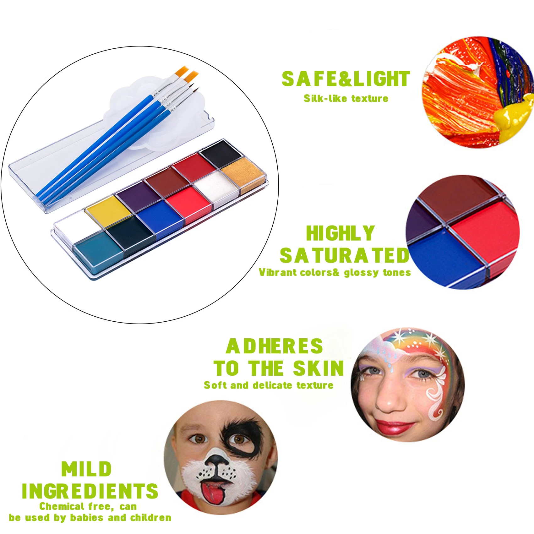 Яркий: содержит 12 ярких цветов с кремовыми оттенками. Легко наносится на лицо и тело для специальных видов художественного макияжа и окраски спецэффектов. Также можно легко смешивать вместе для удовлетворения различных потребностей в макияже.