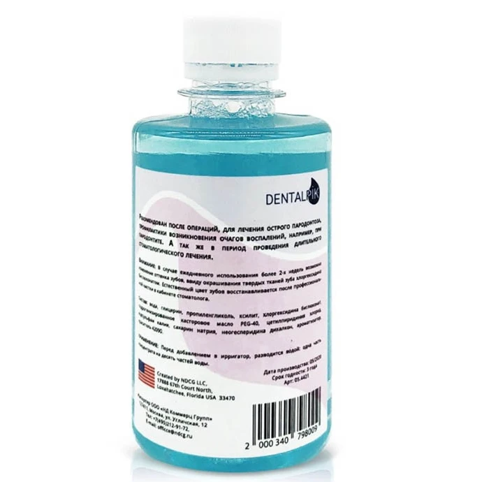 Раствор для ирригатора. Антибактериальное действие. Объем 250 мл. Рекомендован после операций, для лечения острого пародонтоза, профилактики возникновения очагов воспалений, например, при пародонтите.