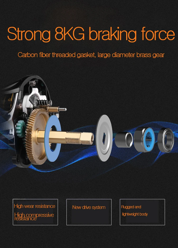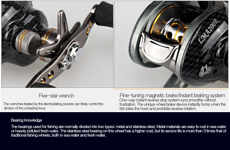 Односторонняя система мгновенного обратного останова работает плавно без разочарования. Уникальное колесо тормозного устройства мгновенно фиксируется, когда рыба кусает крючок и препятствует обратному вращению. Подшипники, используемые для рыбалки, обычно делятся на два типа: металл и нержавеющая сталь. Металлические материалы легко ржавеют в морской воде или сильно загрязненной пресной воде. Подшипник из нержавеющей стали на этом колесе имеет более высокую стоимость, но его срок службы более чем в 3 раза превышает срок службы традиционных рыболовных колес, как в морской воде, так и в пресной воде.