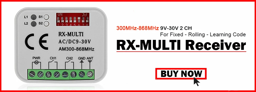 Продукт является общим смарт-приемником и может быть совместим с большинством беспроводных приемников на рынке, включая фиксированный код (2262, 2260,2264,5326,M1E,M5E и т. Д.), код обучения (1527, 2240, 6P20B, 6P20D и т. Д.). Код roling (HCS301,HCS300,HCS200,HCS201,HSC100,HCS1O1 и т. Д.) и часть индивидуального пульта дистанционного управления.
