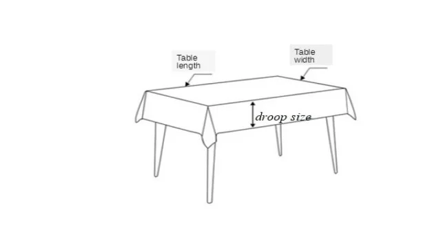 Ширина скатерти = ширина стола + размер капель x 2 (Пожалуйста, обратите внимание на это, потому что обе стороны должны дропнуть, поэтому необходимо добавить два размера)