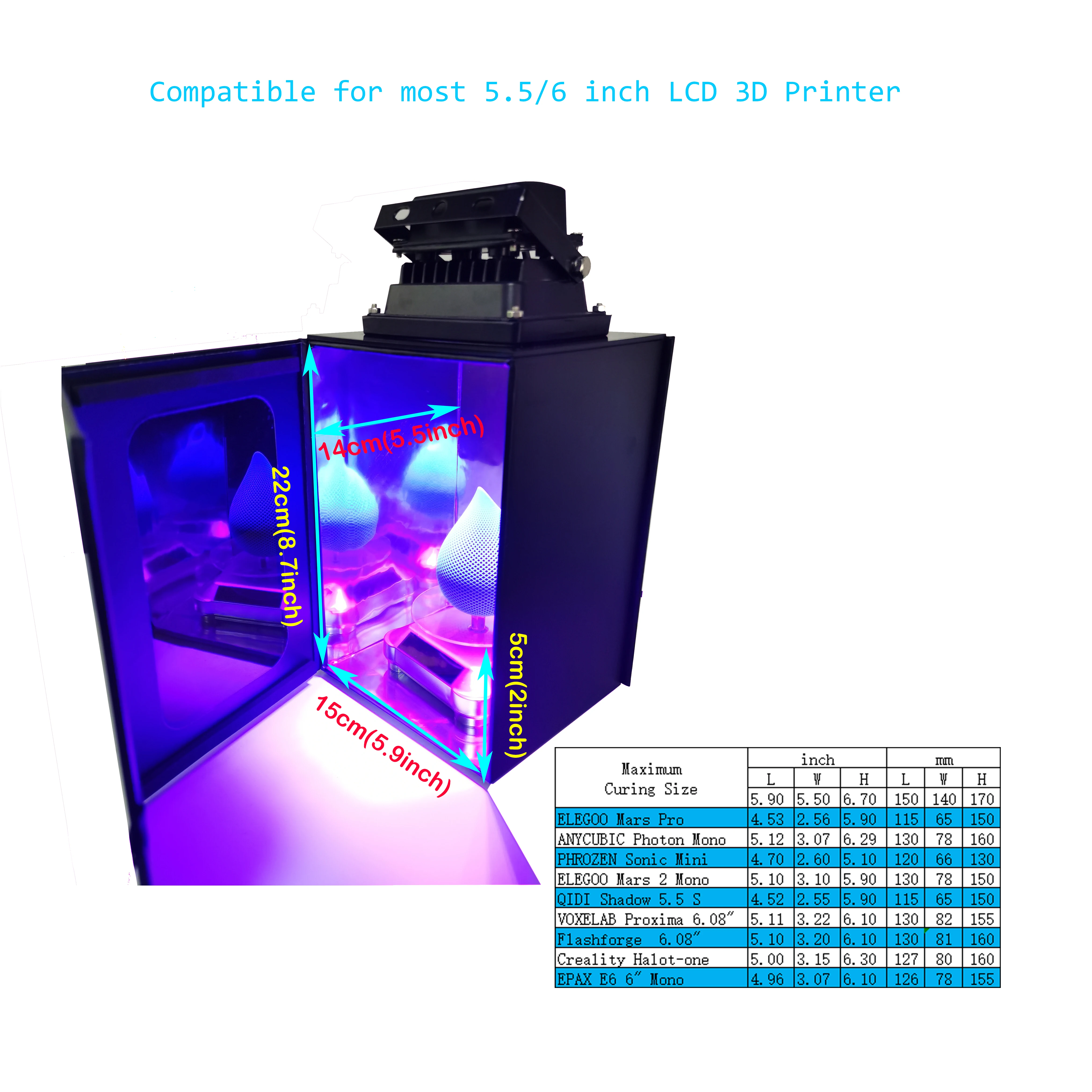 【Отражающий лист и достаточно отверждающее пространство 】внутри шкафа есть отражающий лист, который имеет освещение, сфокусированное, чтобы получить лучший эффект отверждения. Размер отверждения 140*150*170 мм, достаточно для большинства 5,5/6 "полимерных принтеров для отверждения их печатных работ