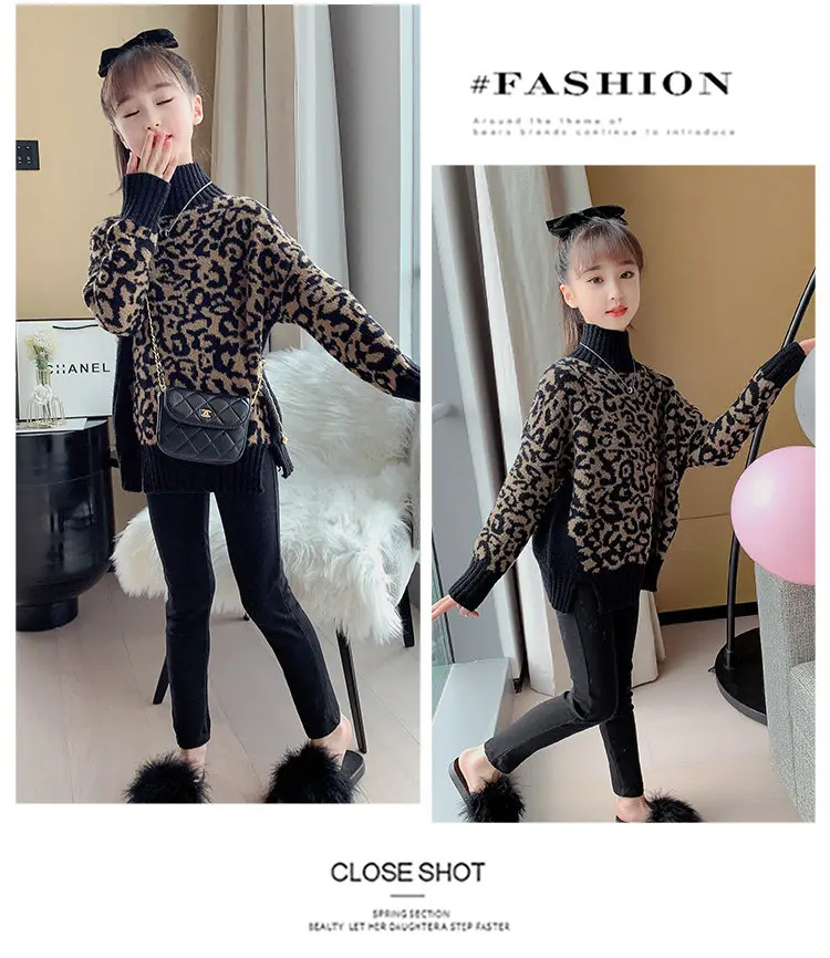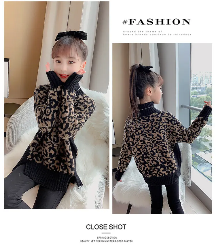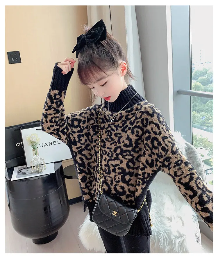 Свитер с высоким воротником и леопардовым принтом для маленьких девочек Новая осенне-зимняя свободная одежда в Корейском стиле топ для детей 6, 8, 10, 12, 13 лет
