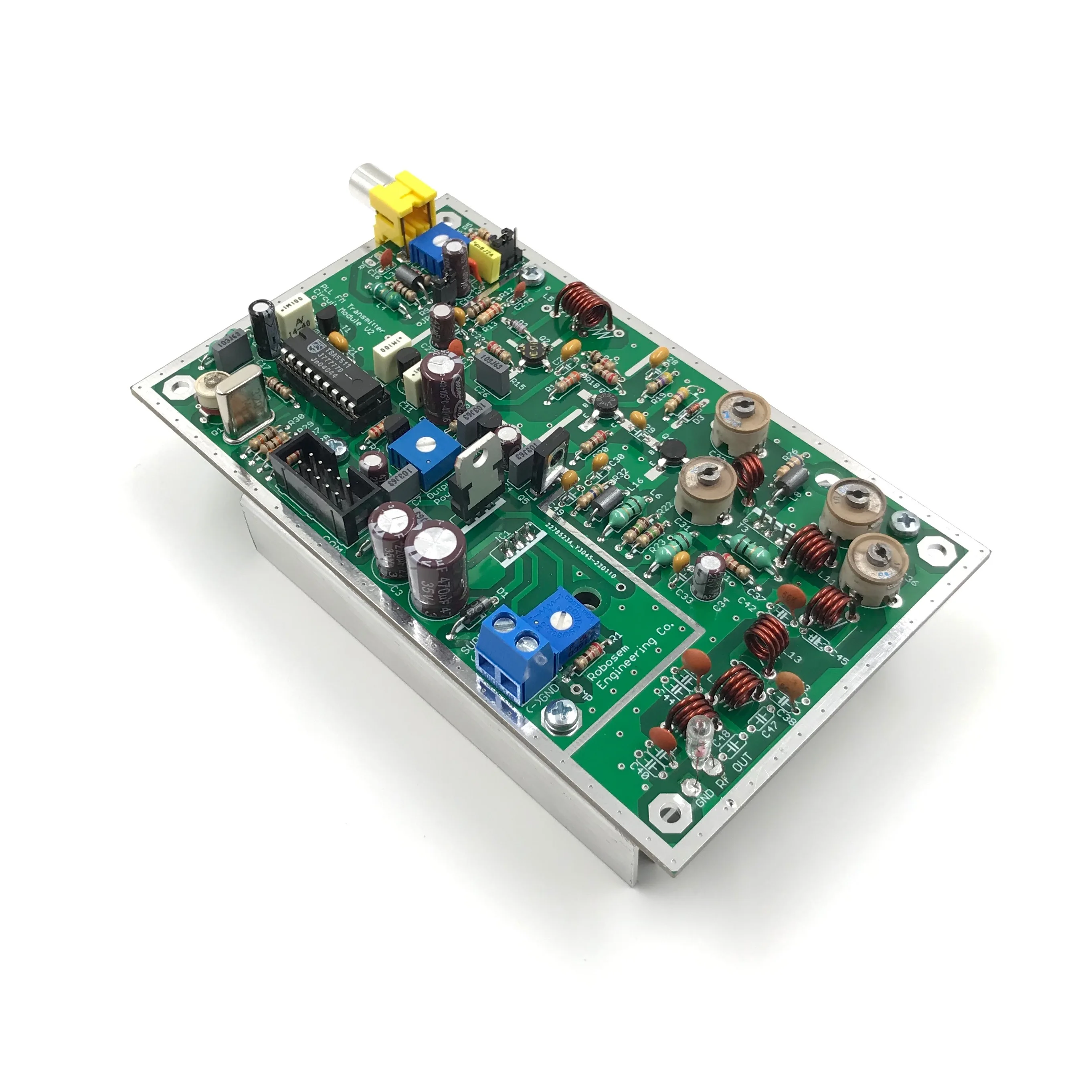 Этот модуль цепи передатчика PLL специально разработан для трансляции в fm-диапазоне. Продукт состоит из PLL управления и радиочастотных усилителей печатных плат. Сигнал передачи, подключенный к аудиовходу, может быть модулирован на желаемой частоте между 87,5-108 МГц благодаря точности управления PLL. Кроме того, выходная мощность передатчика может регулироваться в пределах 0 - 7 Вт.