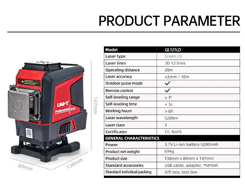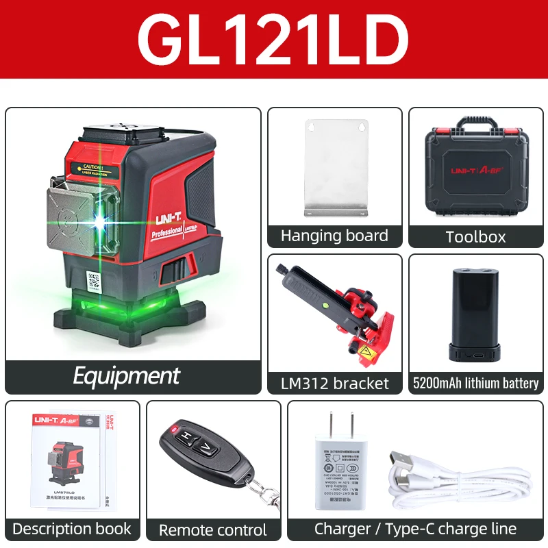 1 лазерный уровень, 1 Магнитный кронштейн тонкой настройки, 1 прокладка, 1 литий-ионный аккумулятор, 1 зарядное устройство (USB), 1 адаптер, 1 пульт дистанционного управления, 1 руководство пользователя, 1 набор инструментов.