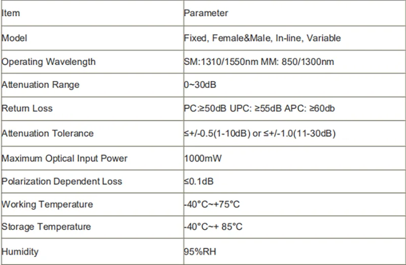 Волоконно-оптические аттенюаторы используются в приложениях, где указано заранее определенное количество потери на светильник. Мы предлагаем LC, FC, SC, ST, MU Фиксированный аттенюатор с разным уровнем затухания, от 1 дБ до 30 дБ.