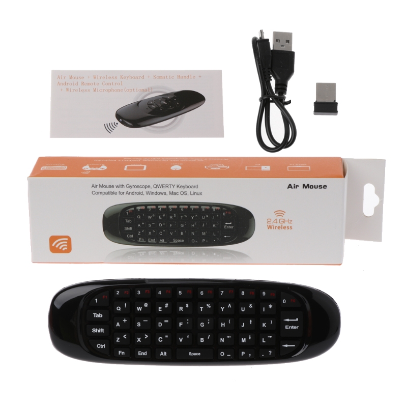 2, это поддерживает беспроводную 2,4G, поэтому вам нужно подключить usb-адаптер air mouse, чтобы получить сигнал 10m. Можно использовать все клавиши клавиатуры.
