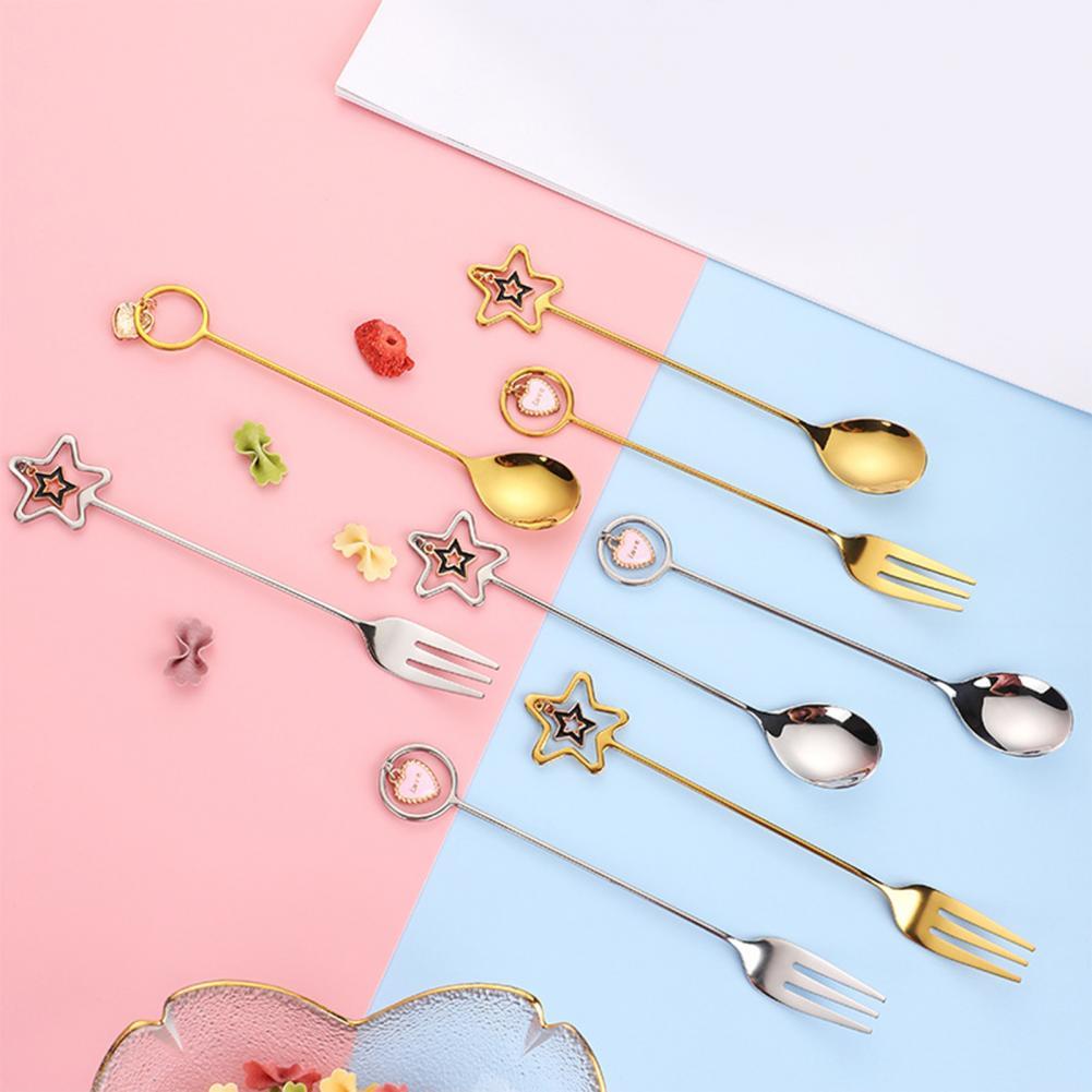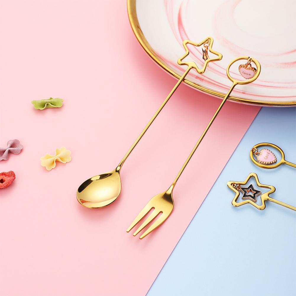 Каждая ложка и вилка поставляется с сердечком или пятиконечной формой звезды на хвосте ручки, чтобы ее можно было использовать в качестве приятного десертного украшения.