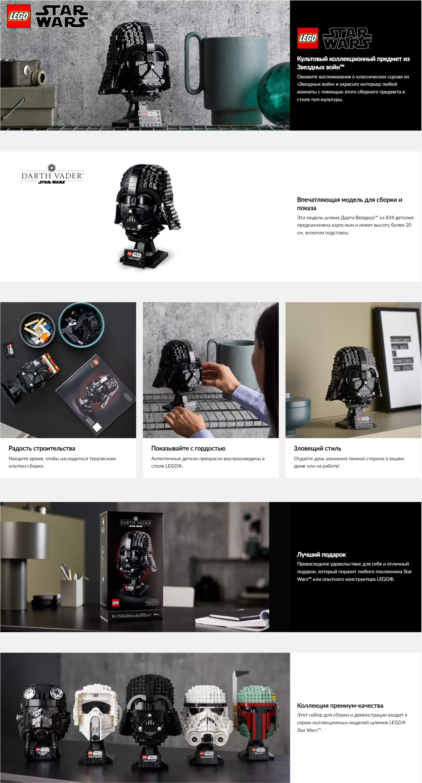 Отдохните от стресса повседневности и насладитесь приятно проведенным временем, воссоздавая каждую зловещую деталь шлема Дарта Вейдера с этим коллекционным набором для сборки LEGO® Star Wars™ (75304).