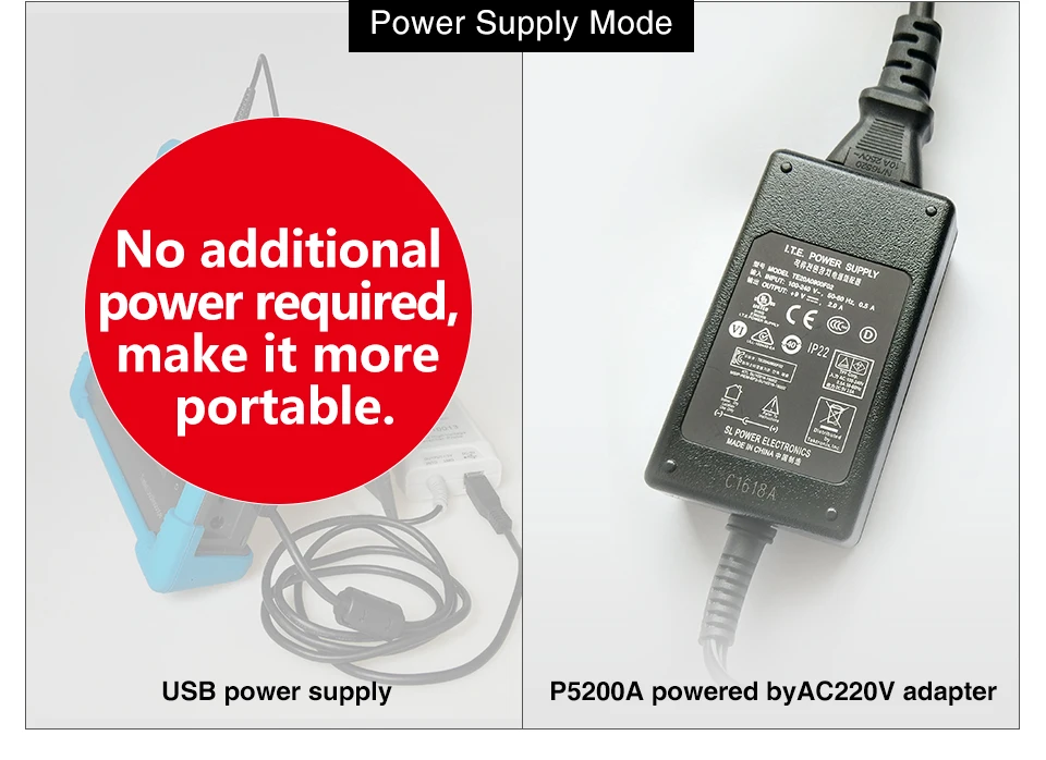 Источник питания USB DC 5V Выход, более портативный, в то время как осциллограф имеет интерфейс USB.