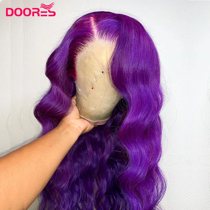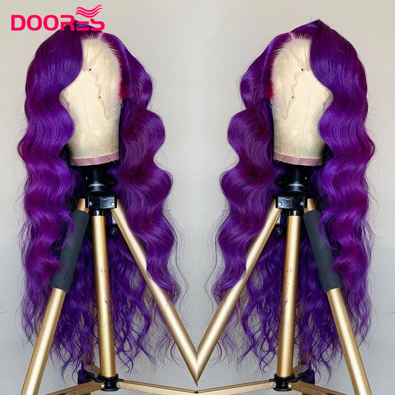 ❤13x4x1 объемная волна фиолетовый парики из натуральных волос для Для женщин фиолетовый Цветной волосы объемной волны Косплэй HD прозрачный парик шнурка может занять от 10 до 30 дюймов