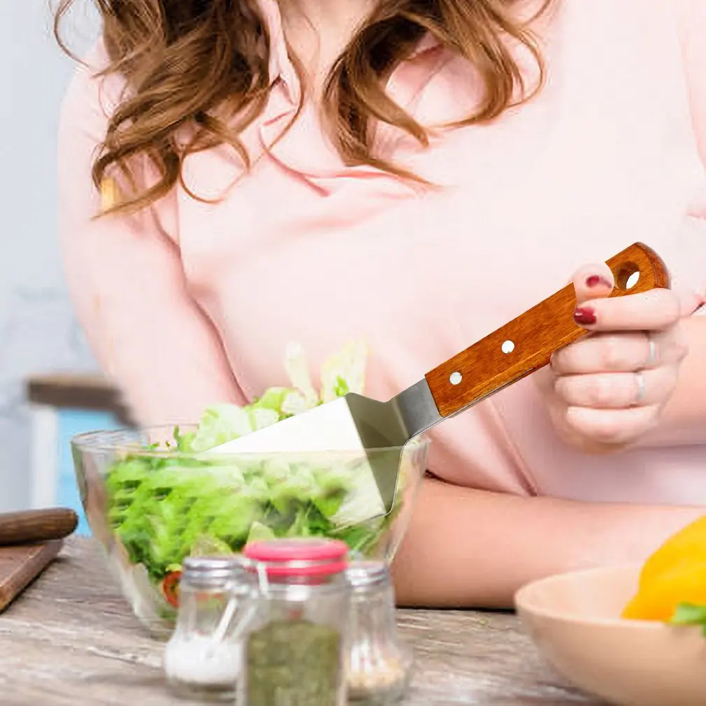 3. Идеальное Сцепление: металл из нержавеющей стали этого шпателя сочетается с высококачественной деревянной ручкой, нескользящей рукояткой, чтобы гарантировать, что шпатель может удерживаться и манипулироваться по желанию даже с мокрыми руками. Деревянная ручка очень изолирована и имеет правильную длину, обеспечивая безопасное расстояние от высоких температур.