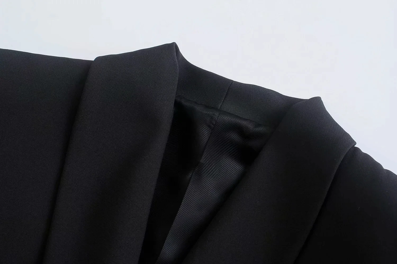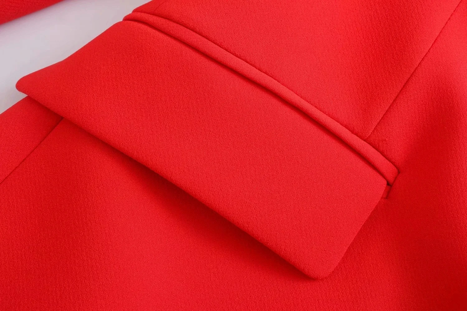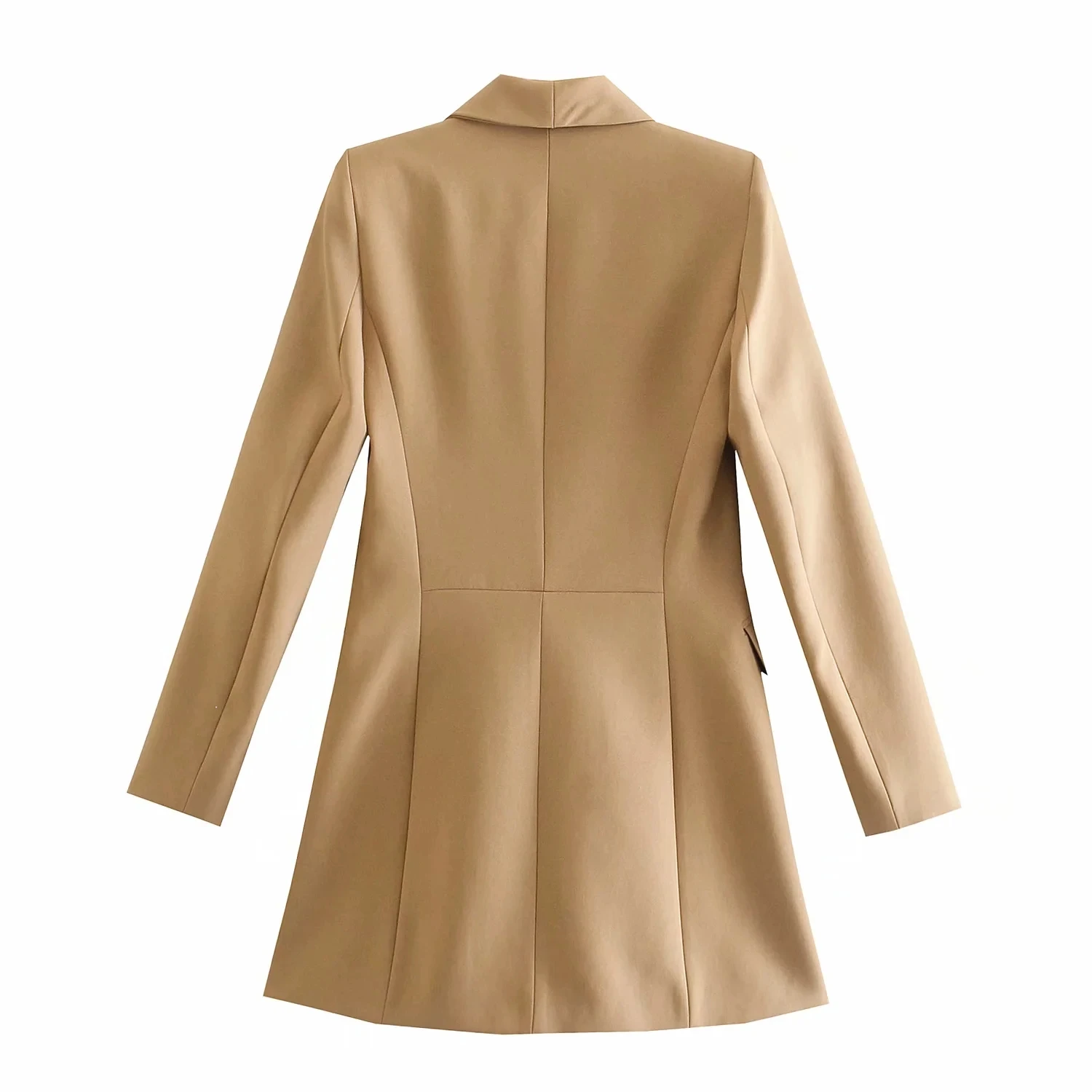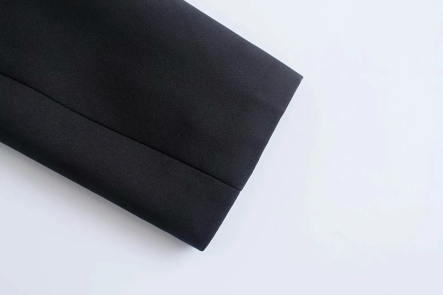 Блейзер с воротником с лацканами, длинными рукавами и ярко выраженными плечами. Передние карманы с клапанами. Двубортная передняя часть с металлической застежкой на пуговицы.