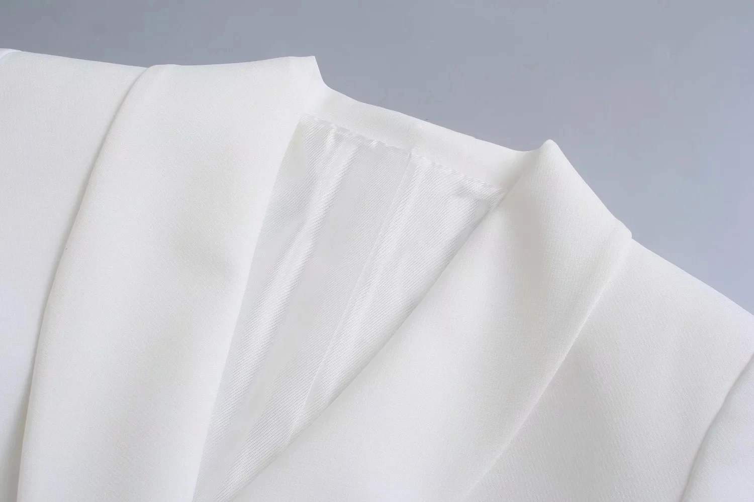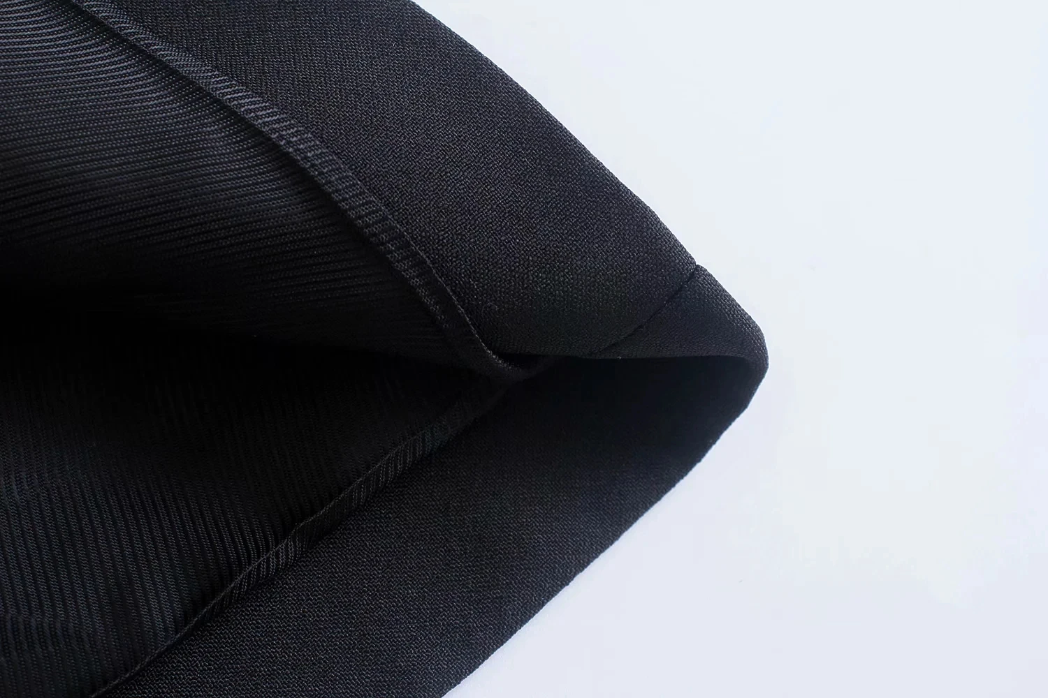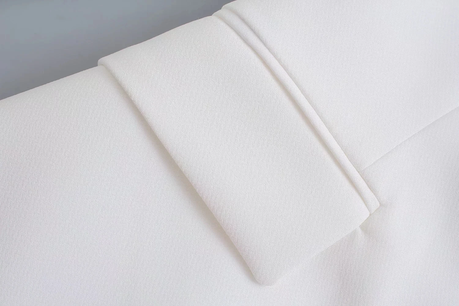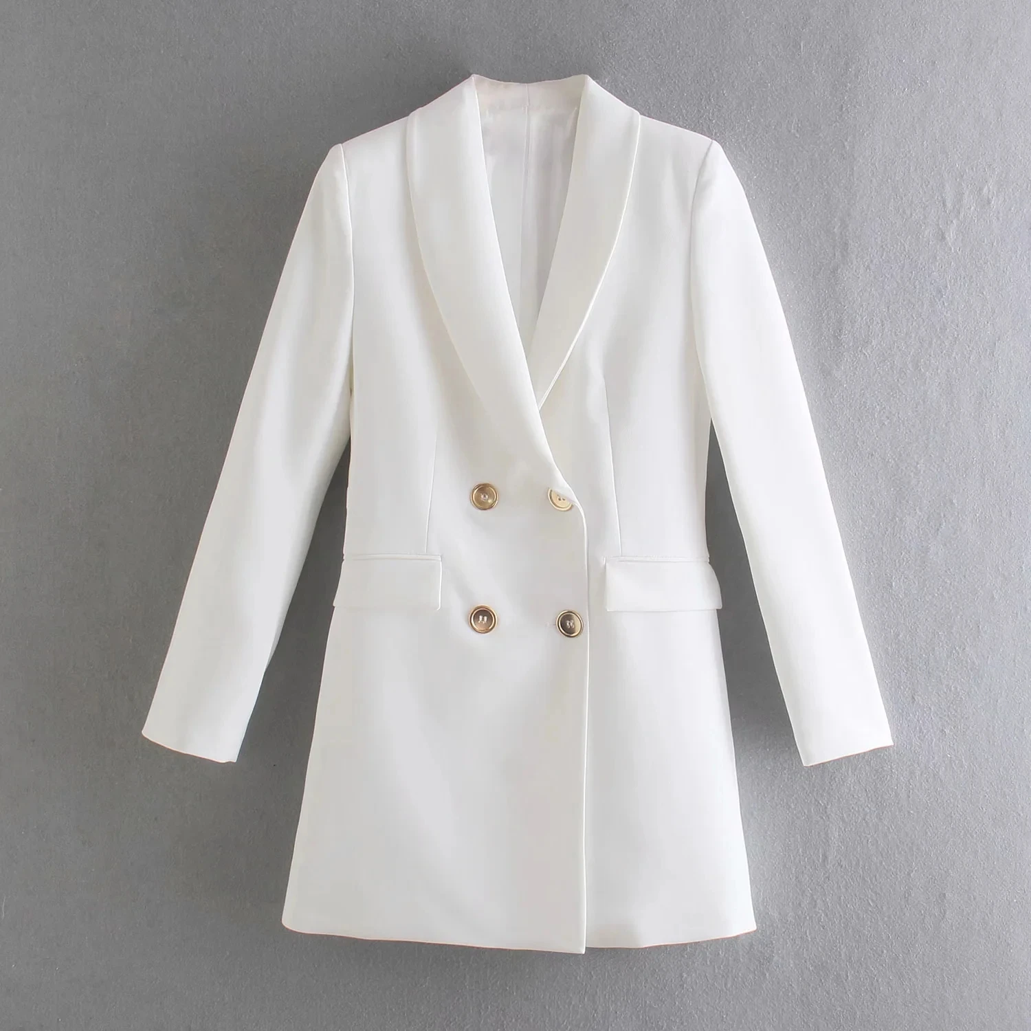 Блейзер с воротником с лацканами, длинными рукавами и ярко выраженными плечами. Передние карманы с клапанами. Двубортная передняя часть с металлической застежкой на пуговицы.