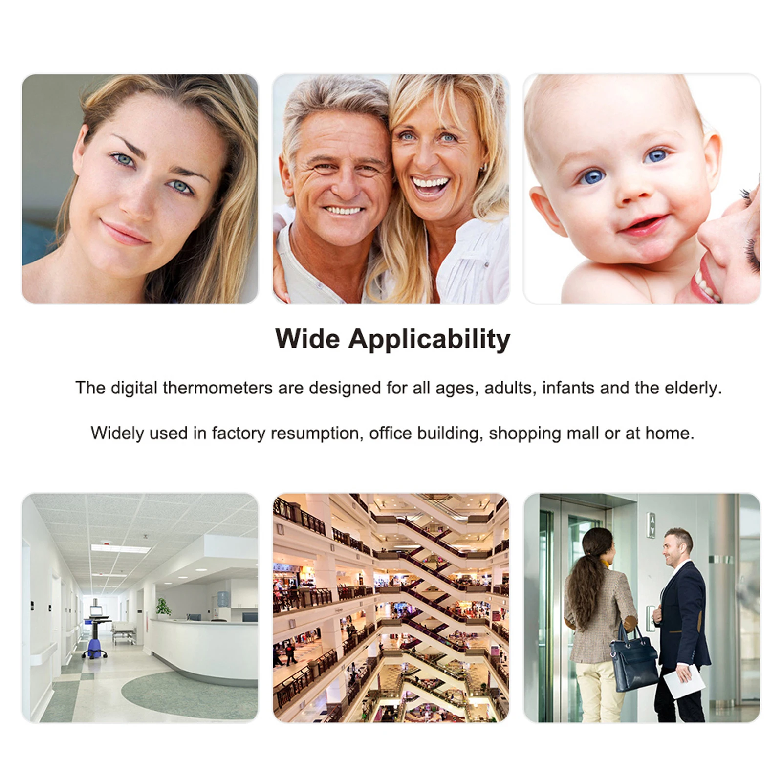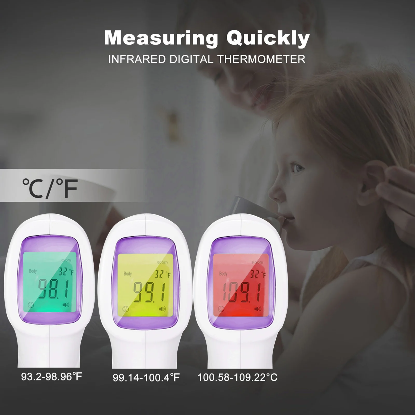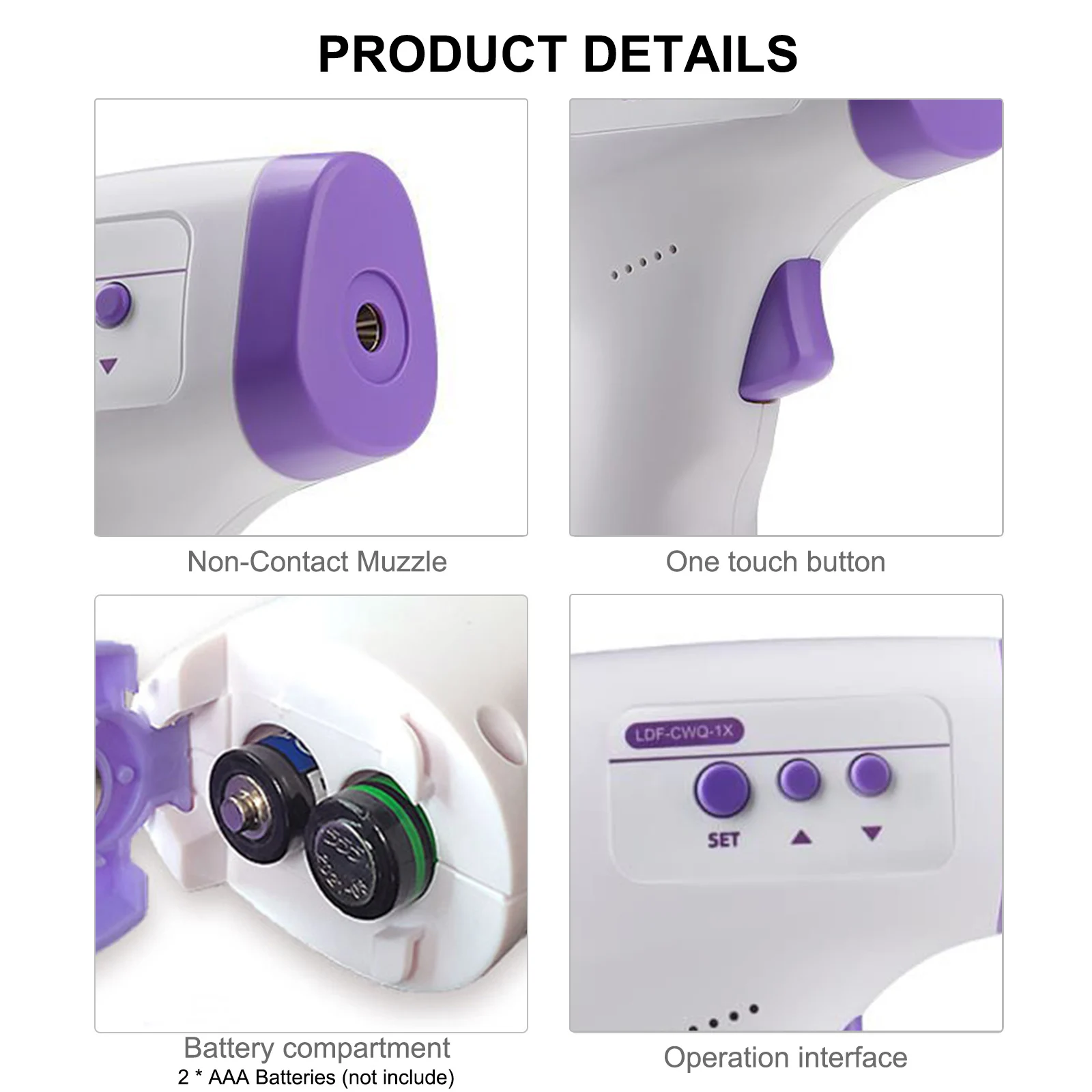 Это Инфракрасный цифровой термометр для лба с высокой точностью, который ручной и портативный для удобства использования. Бесконтактный дизайн эффективно уменьшает перекрестную инфекцию, широко используется для измерения температуры тела. Многоцелевой, он также может быть использован для измерения температуры поверхности объектов. Встроенный высокоскоростной датчик, высокая точность, быстрый результат отображения, не нужно ждать.