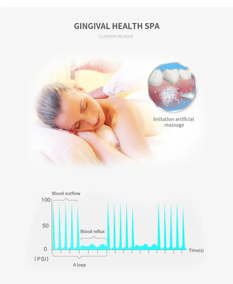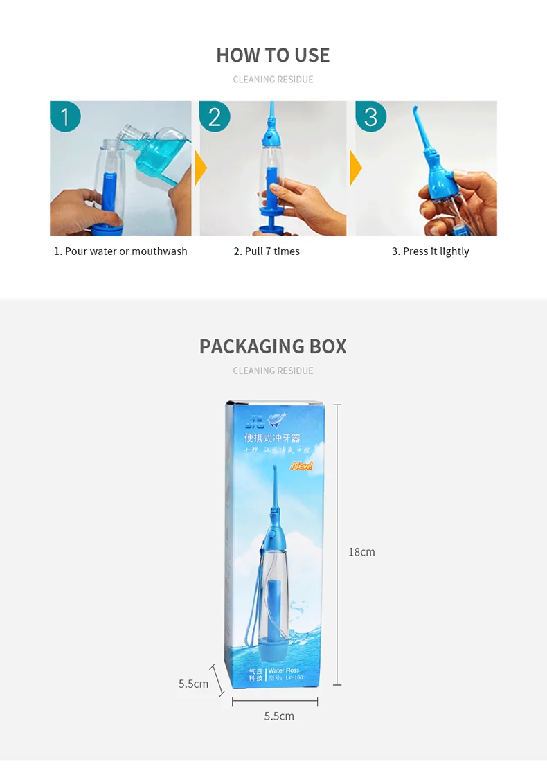 Используя принцип давления воздуха, вручную Потяните 7 раз, добавьте давление воздуха к корпусу бутылки, нажмите переключатель, чтобы образовать мощную колонну воды, чтобы промыть мертвые углы рта, тем самым предотвращая образование зубного налета и зубного камня.