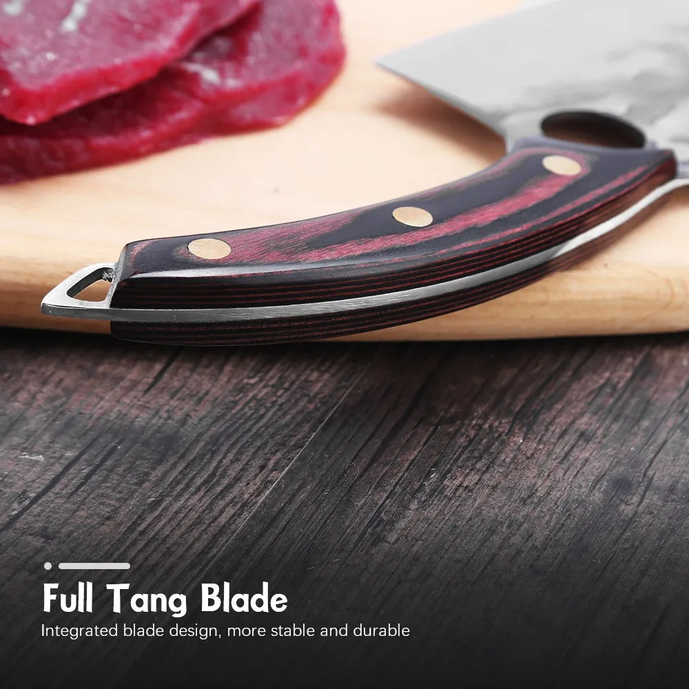-Полная деревянная ручка Tang: эргономичная полная ручка Tang может предотвратить удобство лезвия при захвате и нескользящий эффект. Кухонный нож для мясника-отличная красота и хороший баланс, безупречная производительность, этот сильный дизайн с хорошей прочностью, долговечностью.