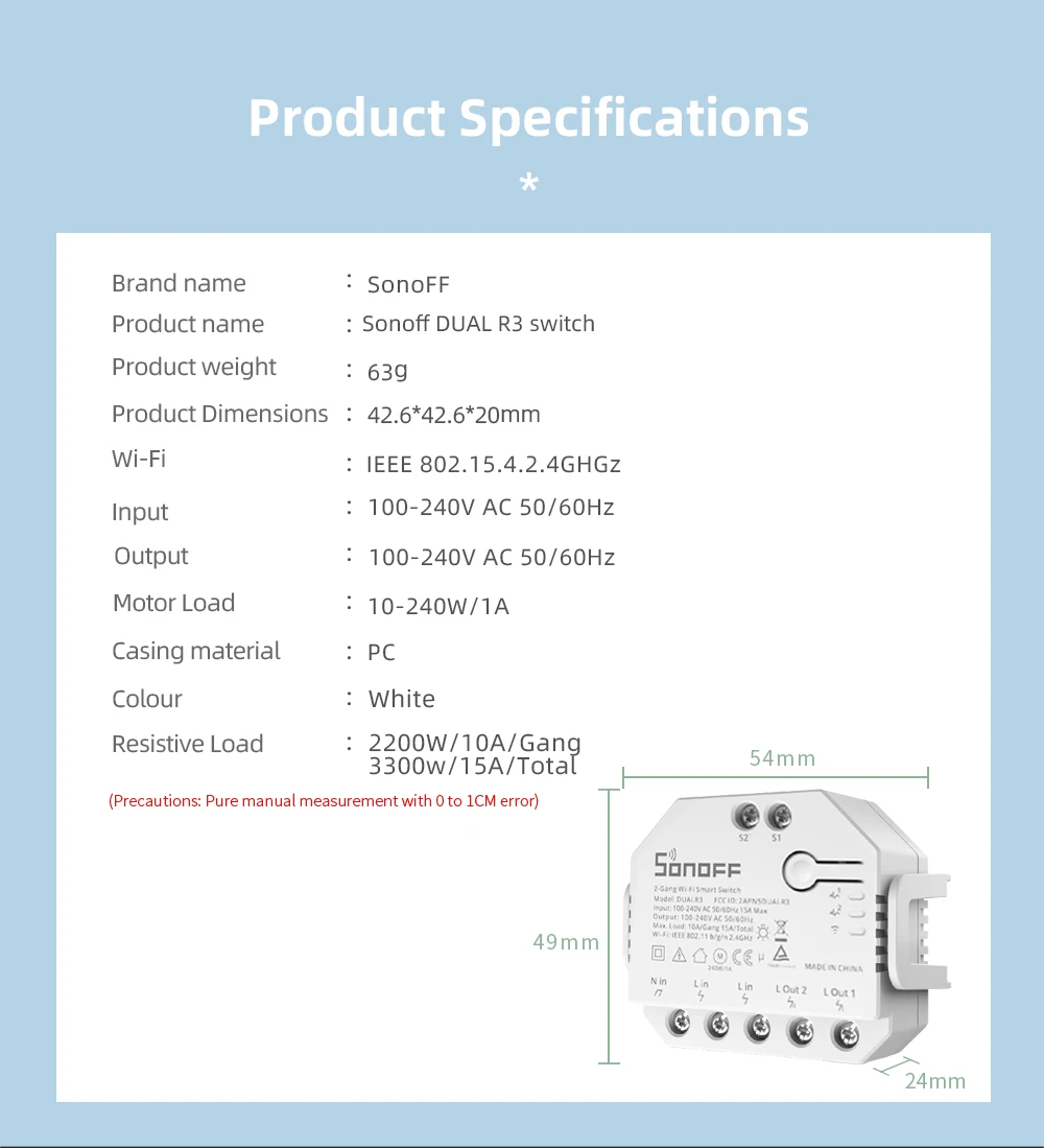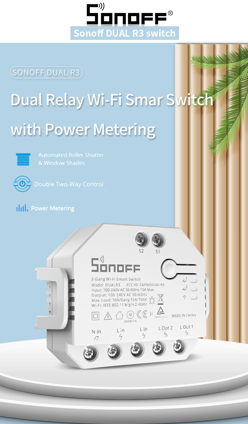 SONOFF DUALR3 выводит ваш дом на следующий уровень. DUALR3-это встроенный модуль беспроводного двойного реле Wi-Fi, который устанавливается за любым стандартным переключателем для передачи его в умный переключатель для беспроводного дистанционного управления с помощью мобильных устройств или голосовой команды. Объединяя ваши бытовые приборы в интегрированную беспроводную сеть, чтобы они общались друг с другом, что удобно для вас управлять и контролировать, включая свет, бытовую технику и моторизованные объекты, такие как рольставни, оконные оттенки, жалюзи, тенты и т. Д.