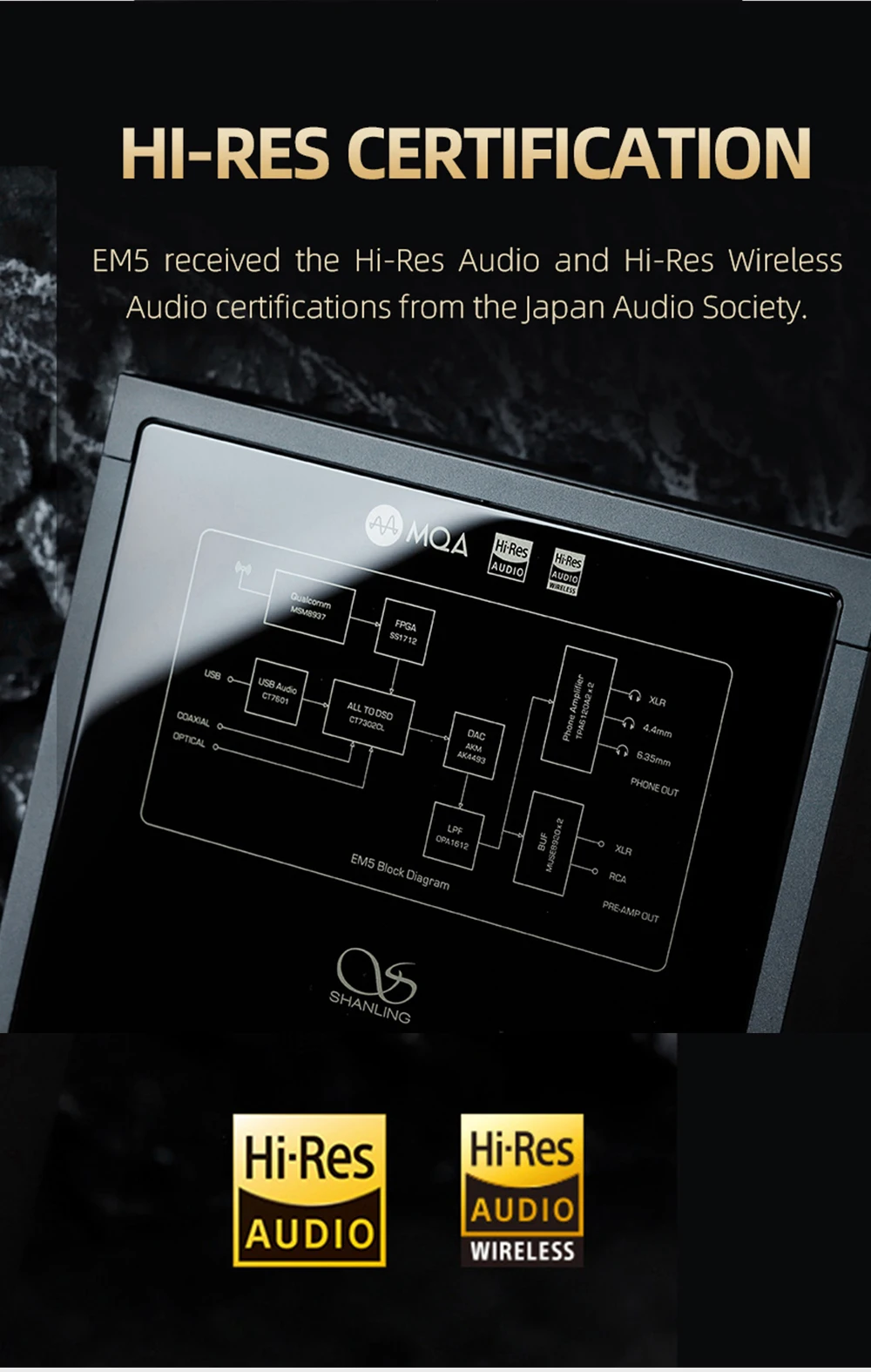 EM5 был разработан как DAC/AMP для высококачественных наушников, с диапазоном различных разъемов, включая сбалансированный XLR и 4,4 мм. Его также можно использовать в качестве DAC и предварительного усилителя в сочетании с отдельным усилителем мощности или активными динамиками.
