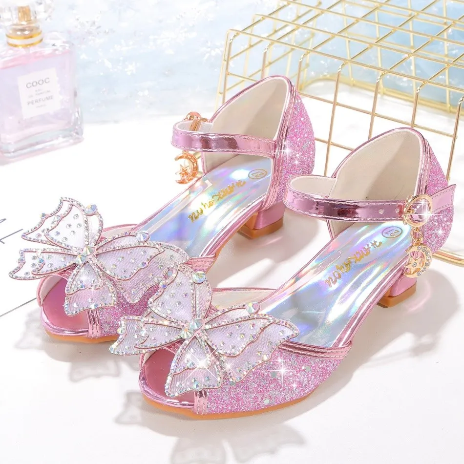 Особенности: модные блестящие сандалии с бантом; Низкий каблук; Обувь без застежки; Мягкая стелька; Удобная обувь на застежке-липучке