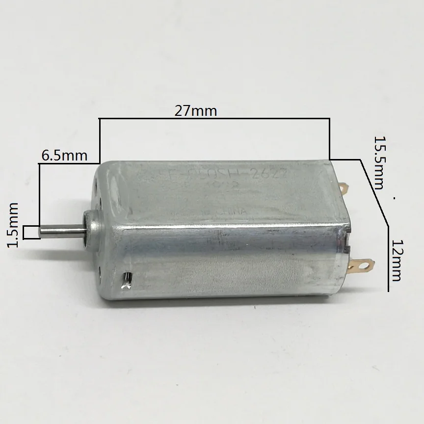 Моторные характеристики: 27x15,5x12 мм (Длина x Ширина x высота)Диаметр вала: 1,5 ммДлина вала: 6,5 ммРасстояние установки отверстия: 10 ммВес: 16,7 гНапряжение диапазон: DC 1-3,7 VНоминальное напряжение: 2 В постоянного токаТок без нагрузки: 0.36AСила тока: 3.2AСкорость без нагрузки: 20000 ОБ/минНапряжение: 1 В постоянного токаТок без нагрузки: 0.34AСила тока: 2.4AЧисло оборотов холостого хода: 10000 об/минНапряжение: 3,7 V DCТок без нагрузки: 0.6AСила тока:> 5AСкорость без нагрузки: 33000 об/мин