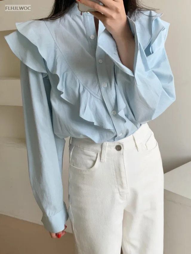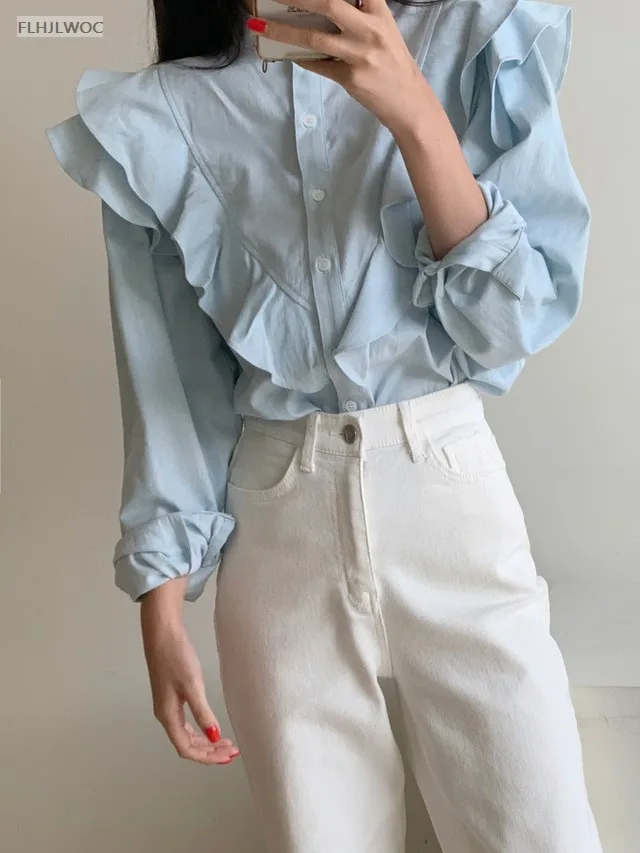 Милые корейские шикарные топы с оборками Лидер продаж Модные женские японские однотонные синие однобортные рубашки на пуговицах для девочек