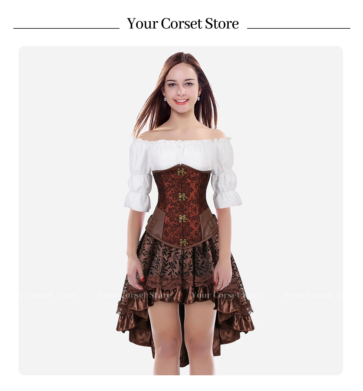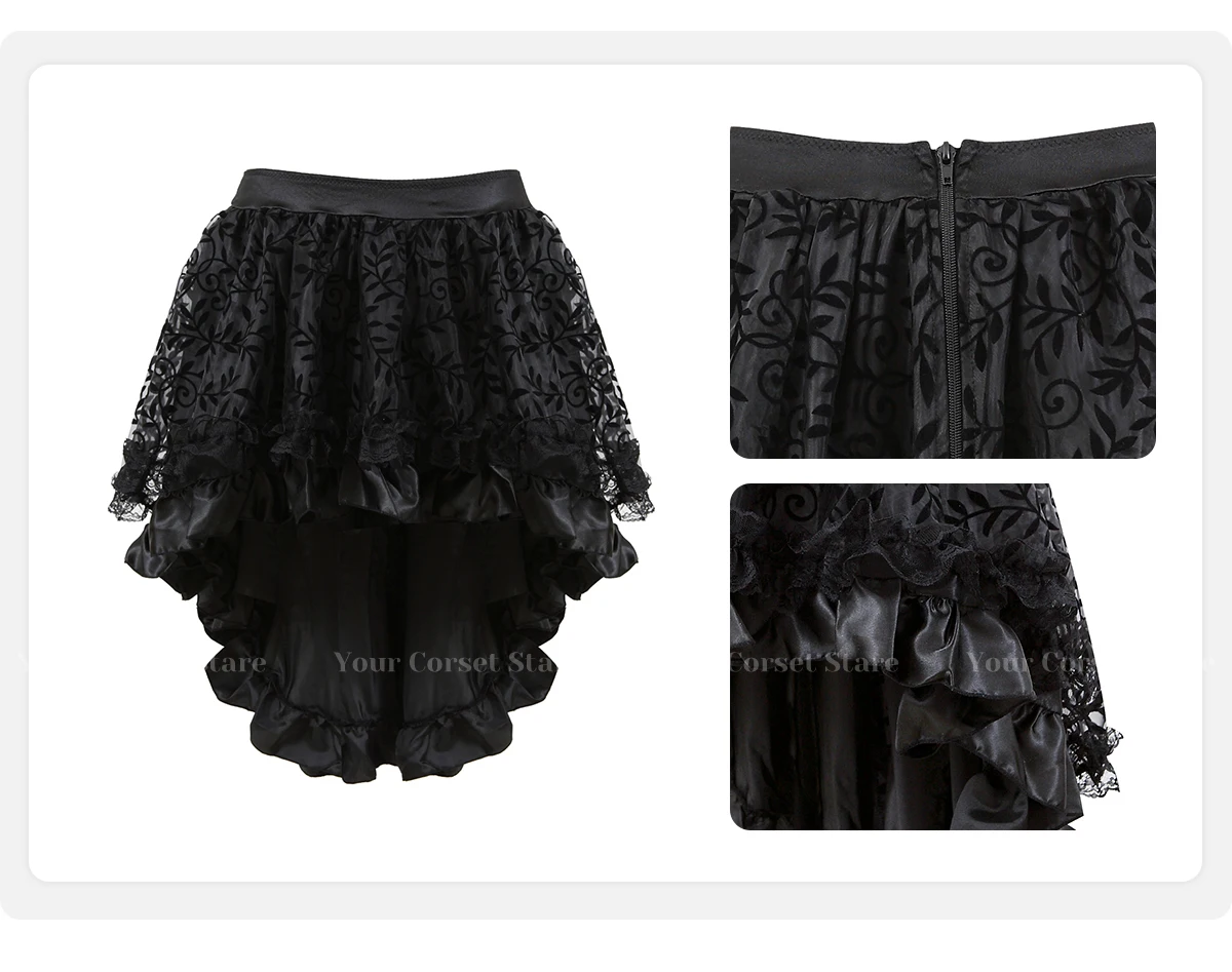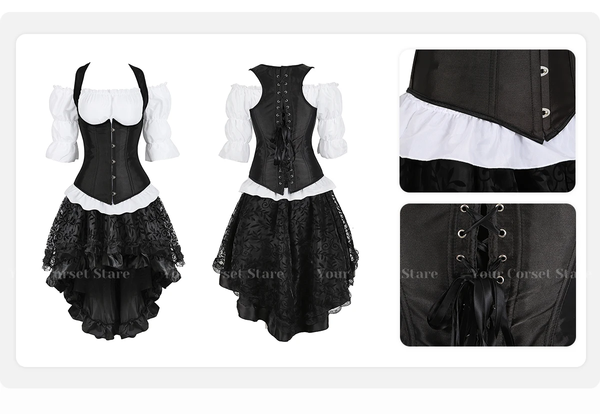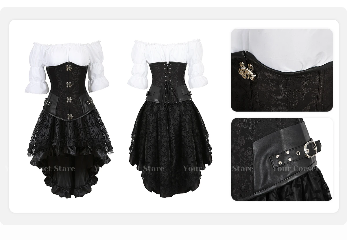 Женская Клубная одежда, комплект из 3 предметов: модная женская рубашка с короткими рукавами и открытыми плечами, средневековый корсет в стиле ренессанс из мягкой ткани, свободный плотный пояс, асимметричный высокий и низкий длина, застежка-молния на спине, кружева и цветы покрывают всю юбку. Носите его, чтобы вы выглядели красиво, элегантно и сексуально
