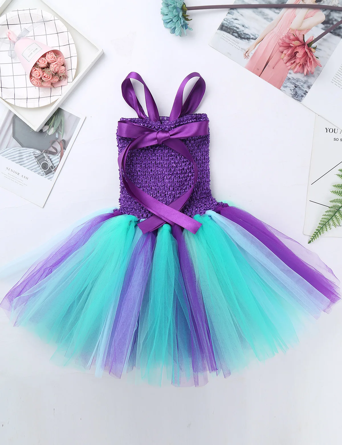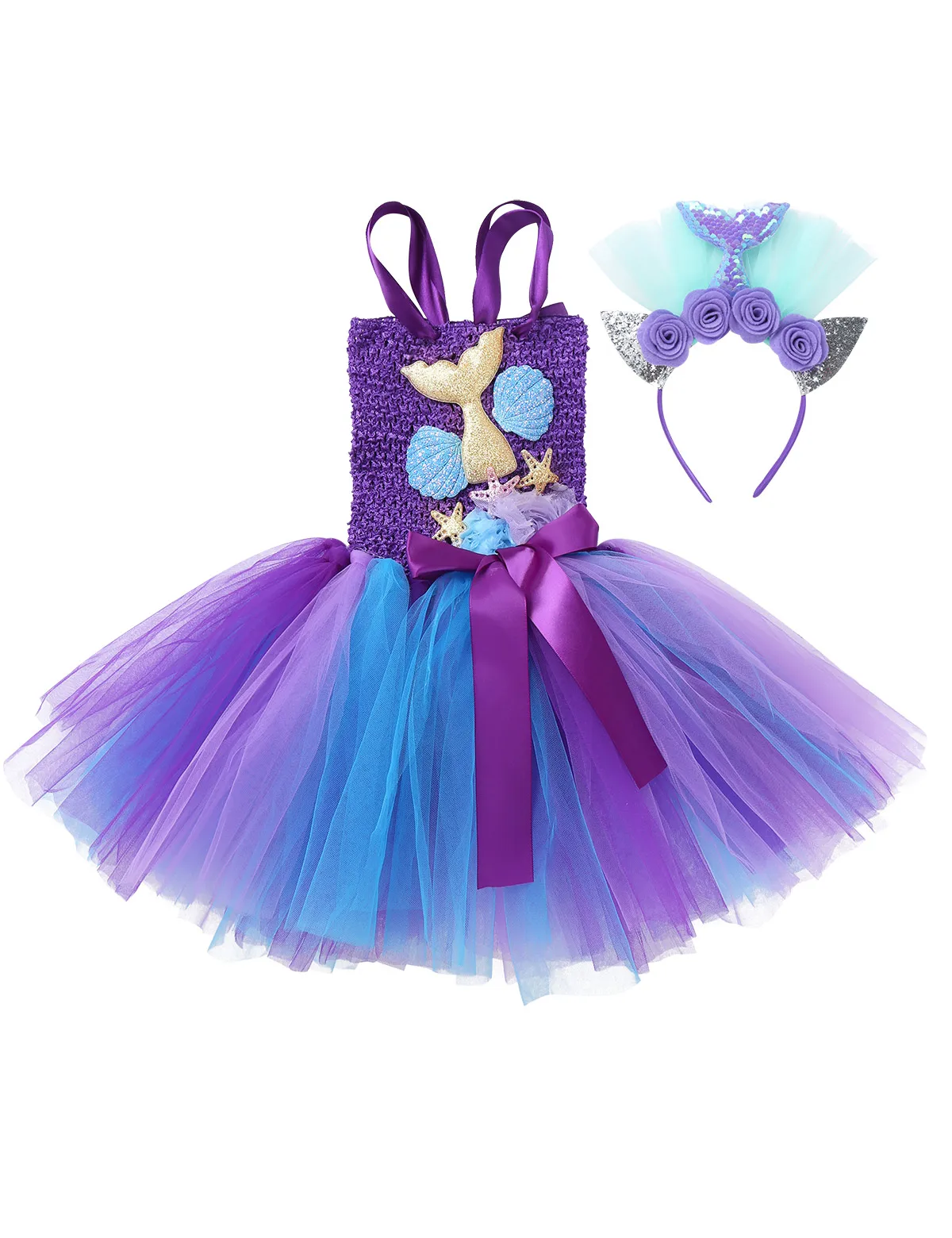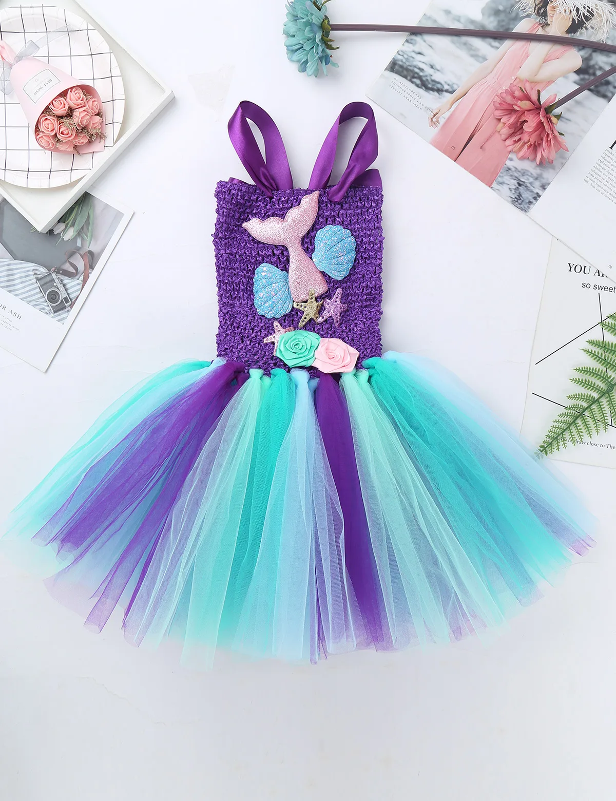 Регулируемые лямки из ленты можно завязать бантом сзади. Эластичный вязаный крючком Топ; Лиф спереди украшен хвостом русалки, гребешком и аппликацией в виде морской звезды.