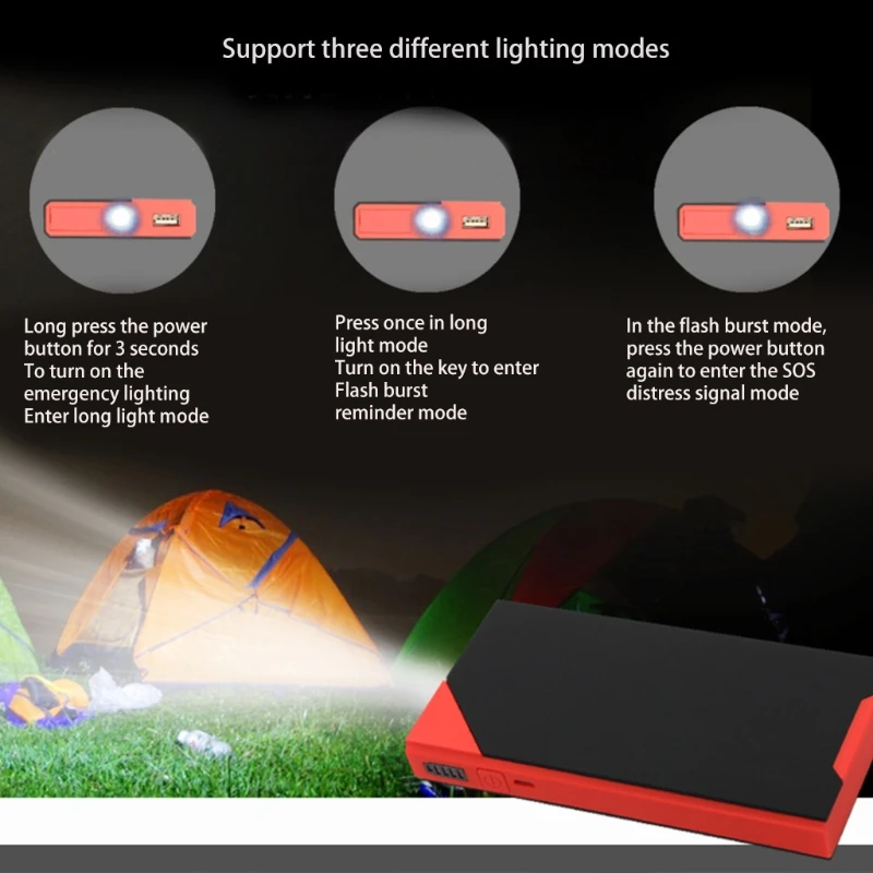 Многофункциональность:Автомобильный аккумулятор Пусковое устройство для стартера с 3 светильник ing режимов, содержащие стабильный, стробоскоп и SOS, он может использоваться в качестве фонарь, спасательные сигнальный светильник и предупредительный дорожный знак светильник.