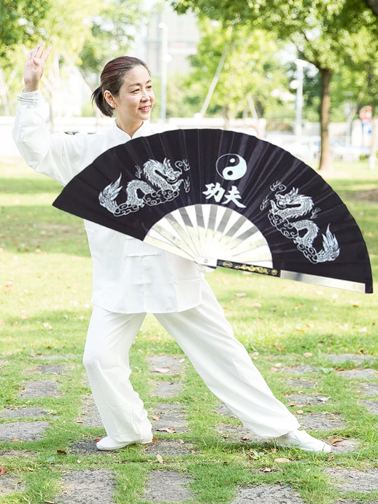 Фитнес-вентилятор из нержавеющей стали кунг-фу с костями из нержавеющей стали, Боковые кости инкрустированы изящным дизайном дракона, У веера есть двойной играющий дракон с жемчугом, а круглая жемчужина-фигурка тайцзи Инь и Ян, тонкая работа и красивая форма. Вентилятор может быть использован для веера ветра и охлаждения тела, но он также может быть использован для танцев набора ослепительного Тай Чи Кунг-фу, для того, чтобы перемещать мышцы и кости, укрепляет тело и ум.