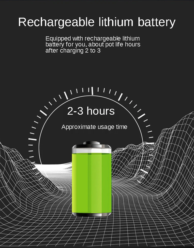 Оснащен перезаряжаемой литиевой батареей для вас, она используется для 2-3 часов после зарядки