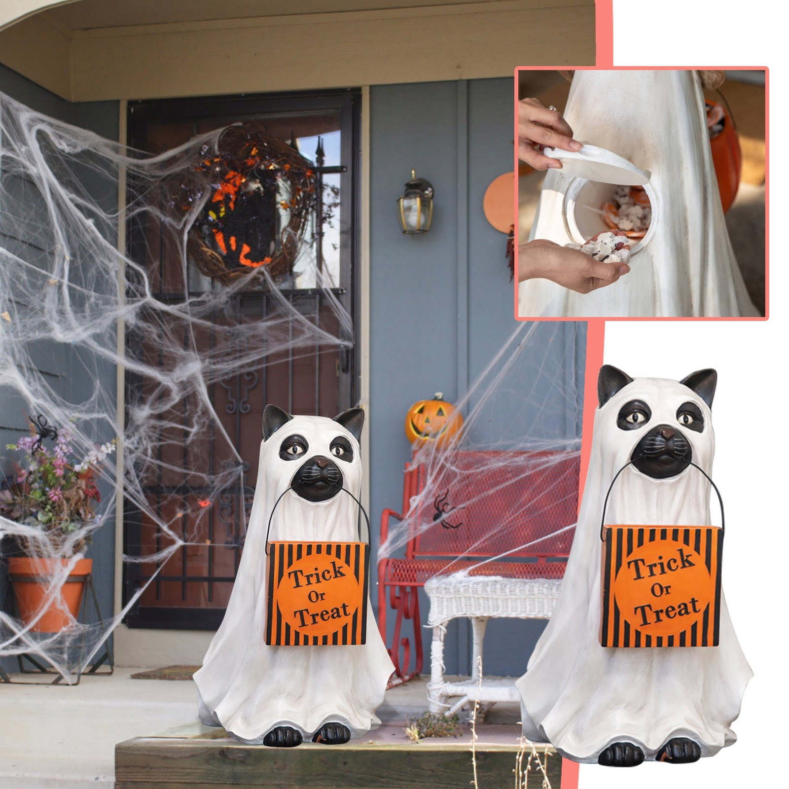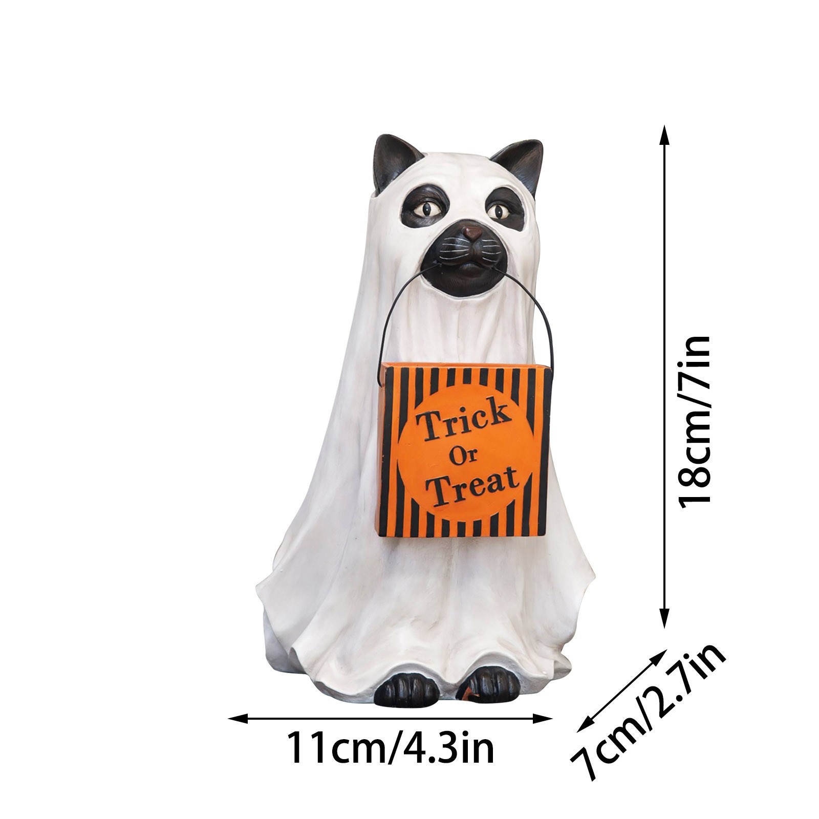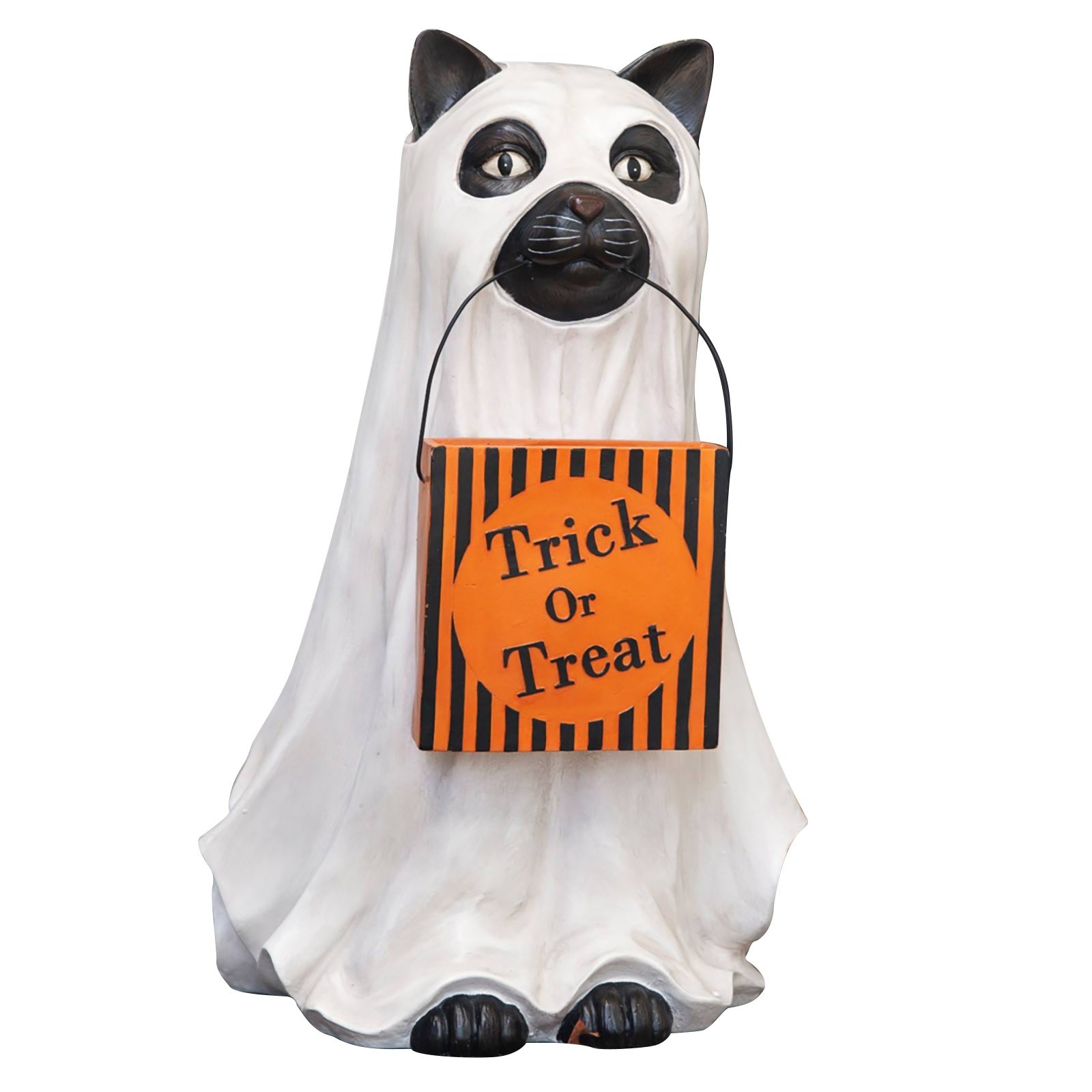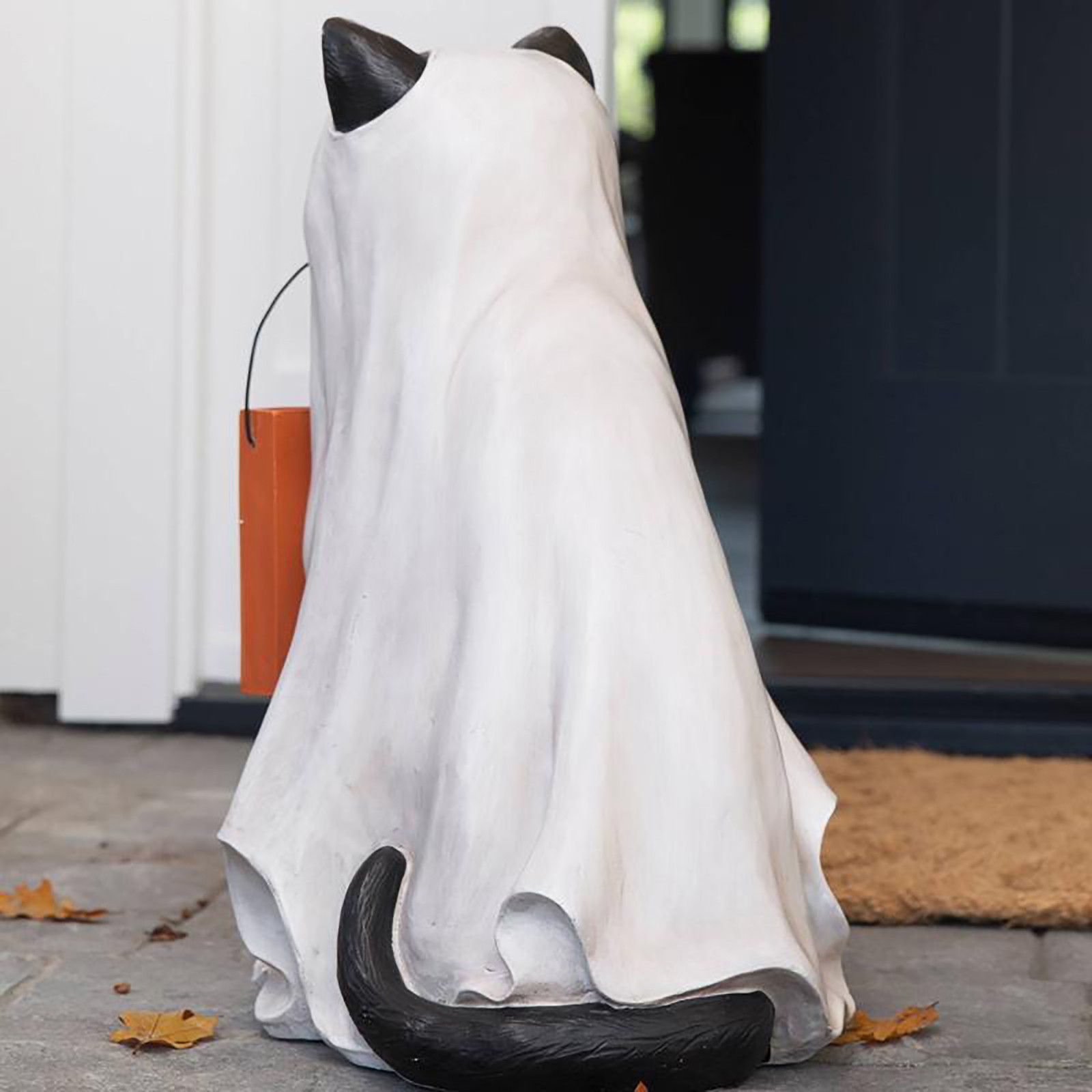 - 【GhostКошкаДержатель для конфет welcome Добро пожаловать в магазин trick-or-treaters в натуральную величинуКошкаОдет как призрак у входной двери. Верный и верный, этот щенок всегда помогает, неся гигантскую чашу с тыквой, которую можно легко наполнять угощениями через желоб сзади. Получите ваших гостей в духе Хэллоуина с этим милым собачьим компаньоном.