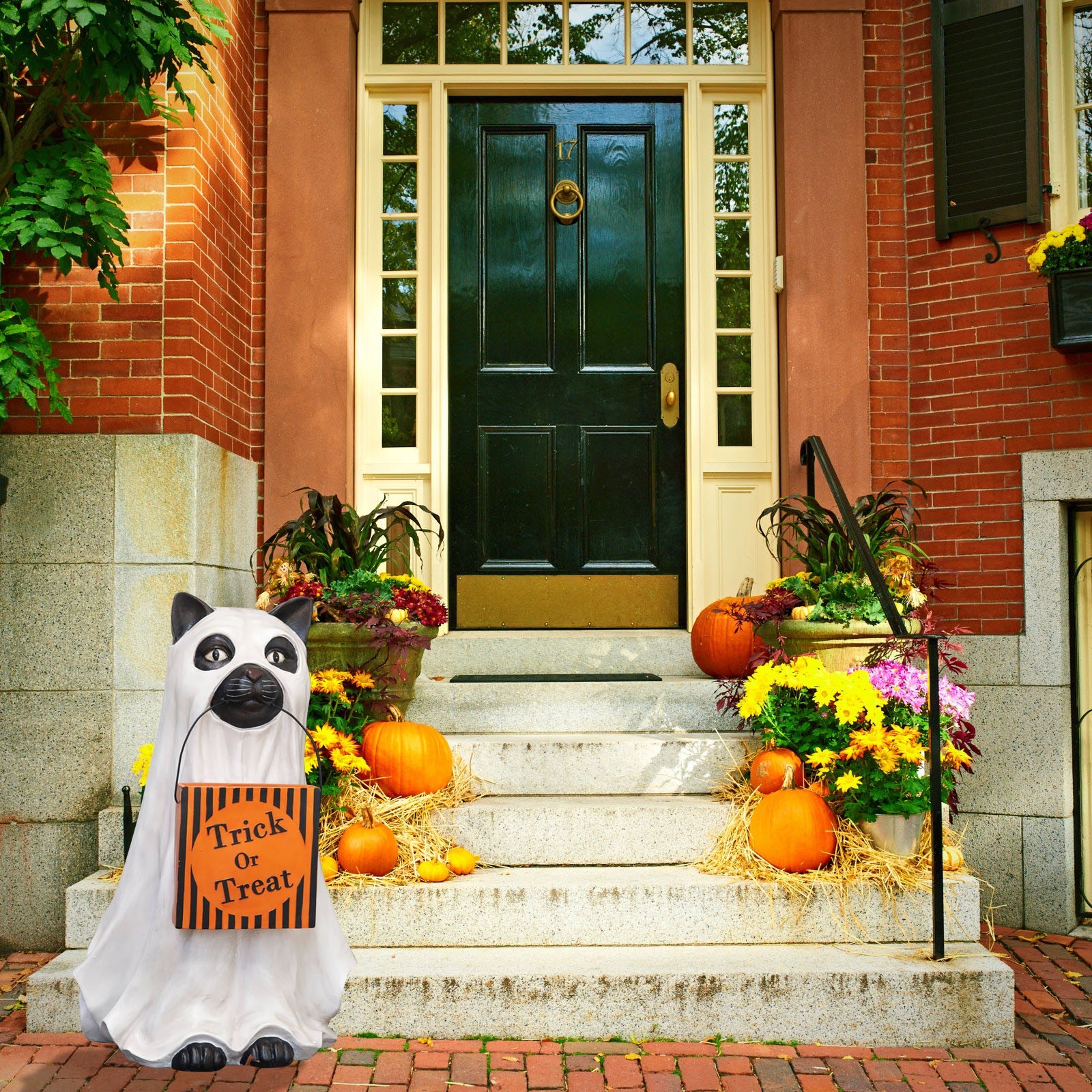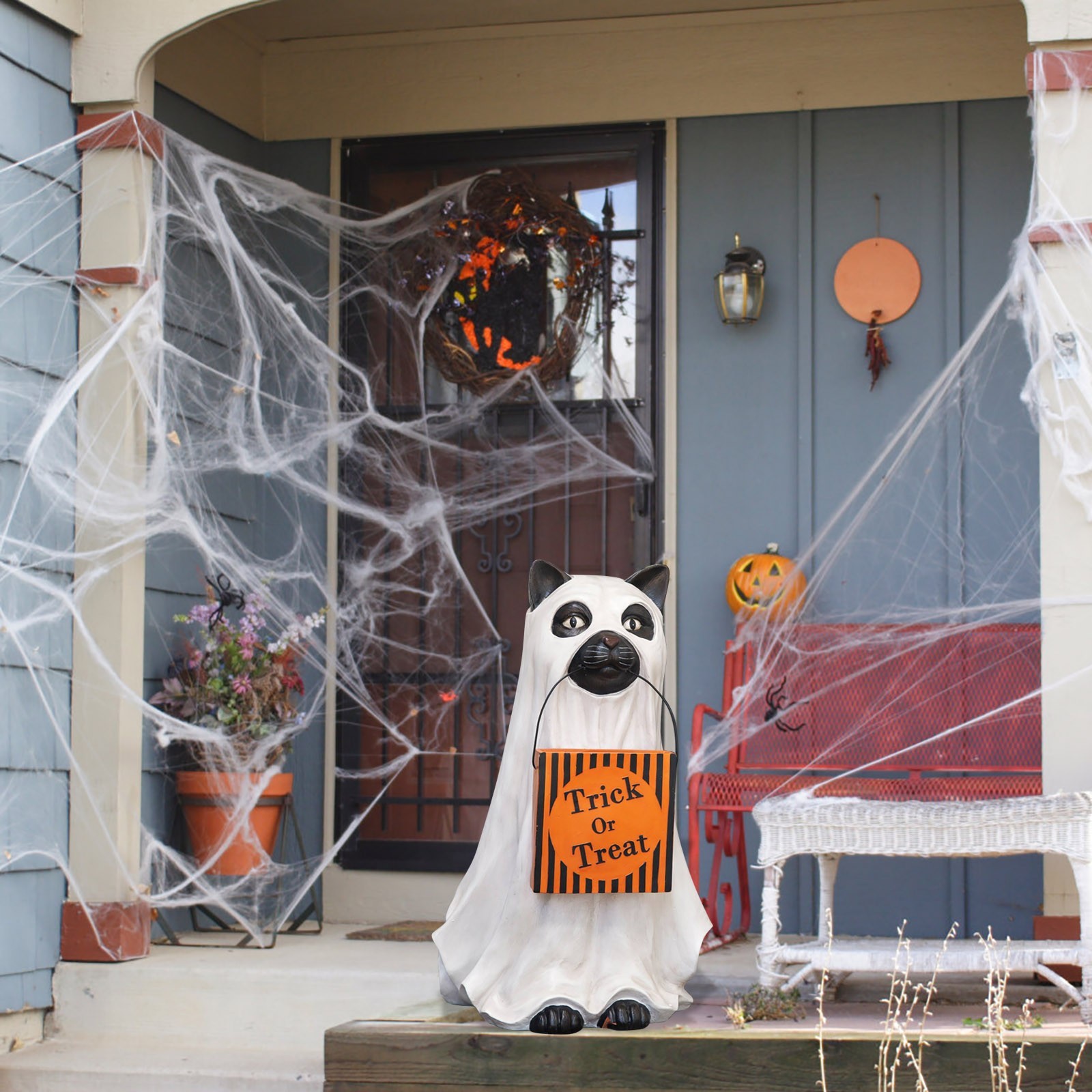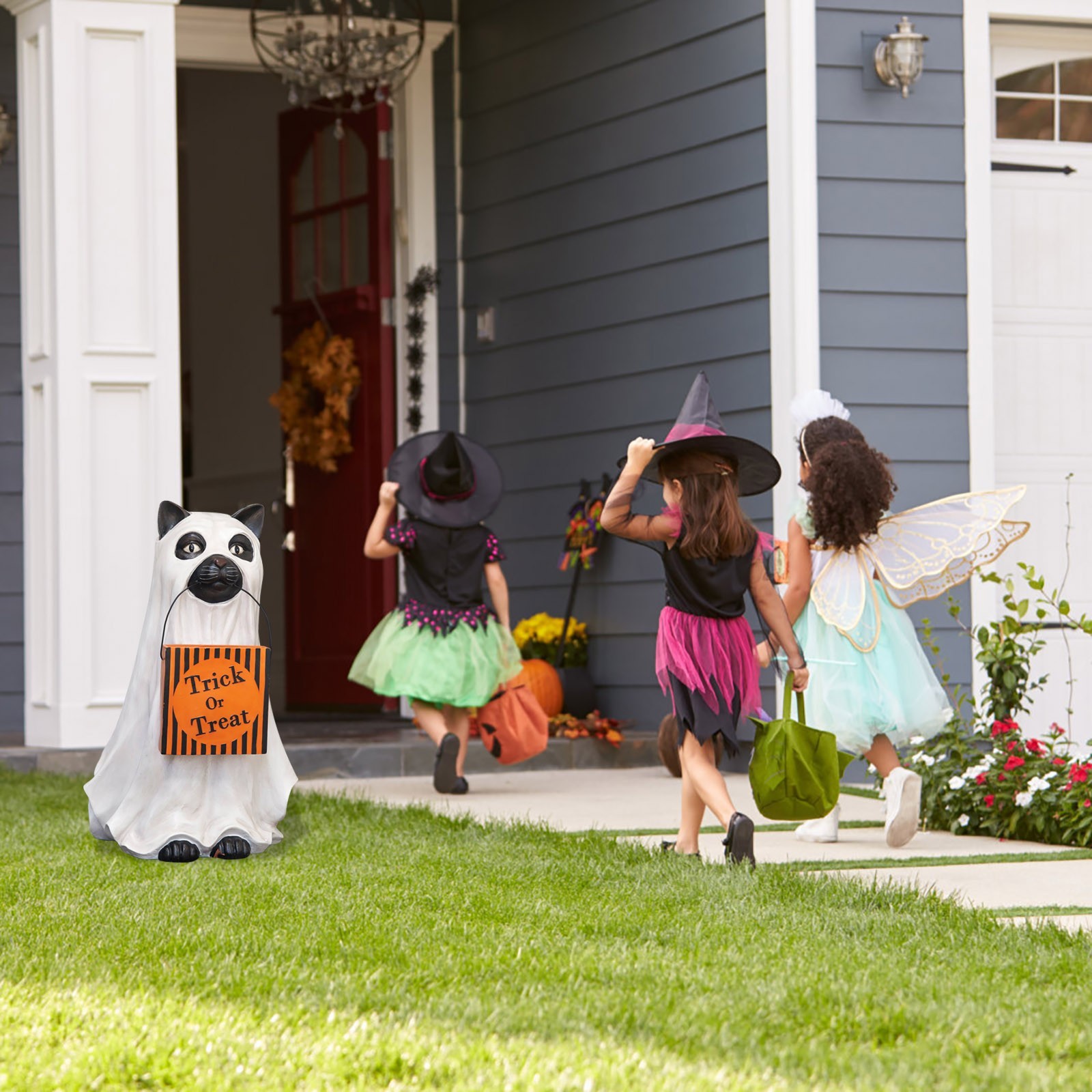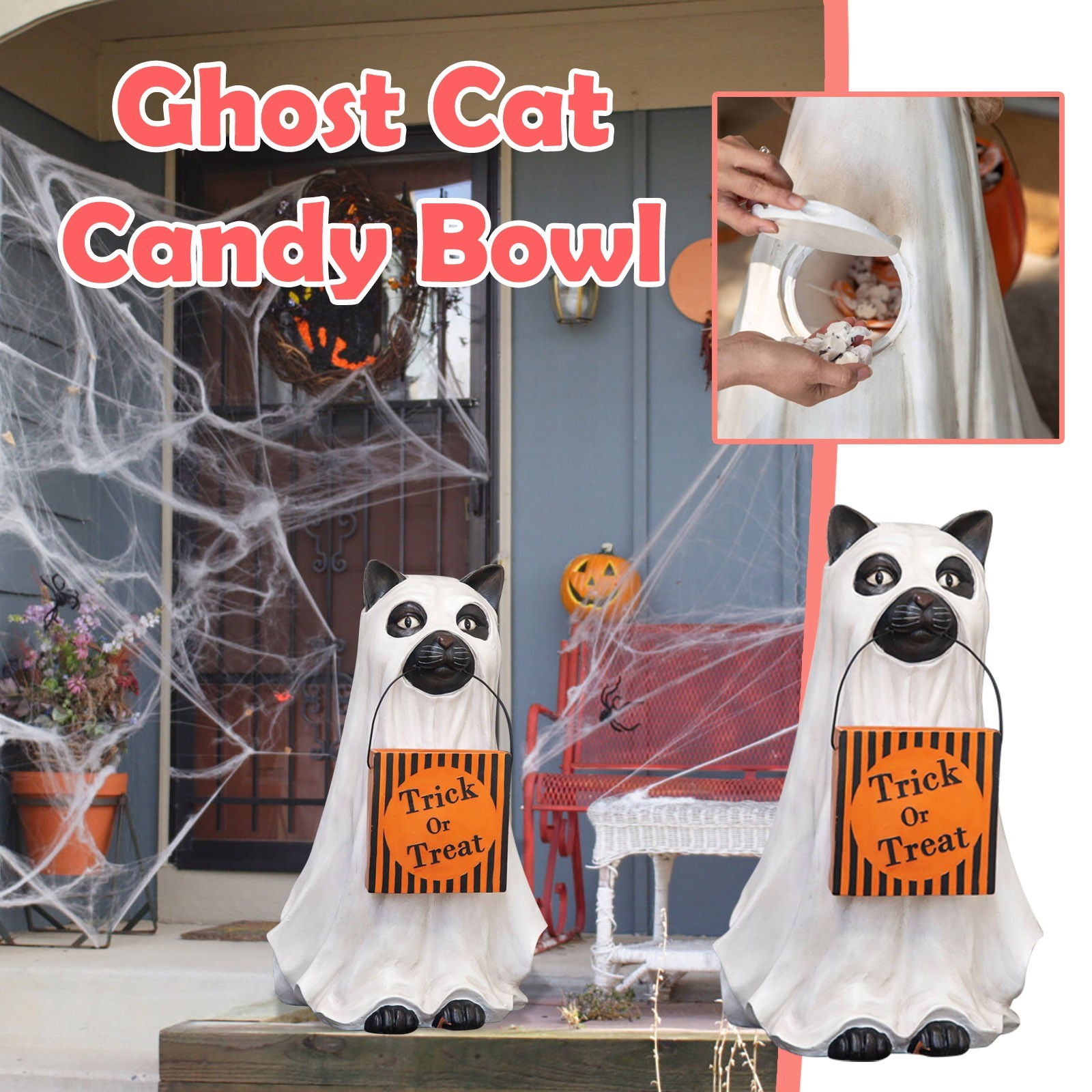 - 【GhostКошкаДержатель для конфет welcome Добро пожаловать в магазин trick-or-treaters в натуральную величинуКошкаОдет как призрак у входной двери. Верный и верный, этот щенок всегда помогает, неся гигантскую чашу с тыквой, которую можно легко наполнять угощениями через желоб сзади. Получите ваших гостей в духе Хэллоуина с этим милым собачьим компаньоном.