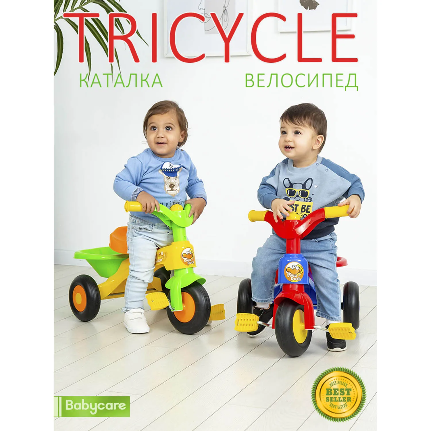 Tricycle бренда Babycare – это трёхколёсный велосипед и каталка. Малыши могут кататься, отталкиваясь ножками от пола: педали у рулевого колеса не будут им мешать. Конструкция с тремя большими колёсами обеспечивает устойчивость, а невысокое удобное сиденье позволяет малышам самостоятельно садиться и вставать.