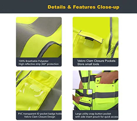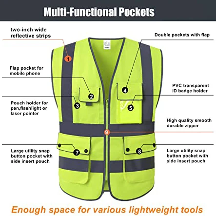 Многофункциональные карманы-высокая видимость безопасности жилет разработан с 5 карманами, 3 из которых имеют Флип-Топ липучки, чтобы предотвратить предметы от падения, 1 ПВХ прозрачный ID значок клип на передней части, 1 карман с клапаном и 1 маленький карман для инструментов, таких как фонарики или ручка. Ниже приведены два больших кармана, которые могут держать мобильные телефоны, ноутбуки и другие предметы.