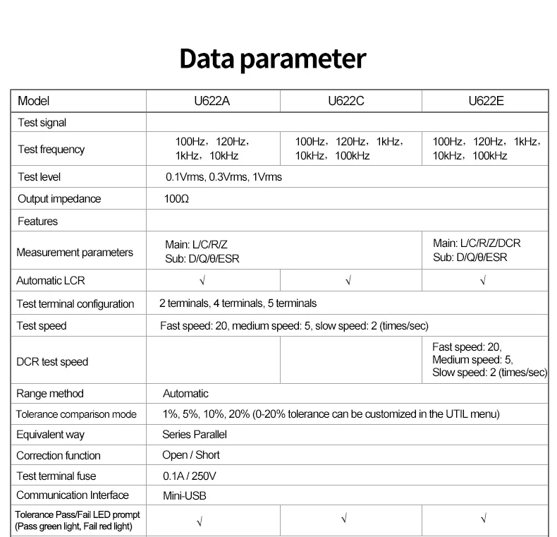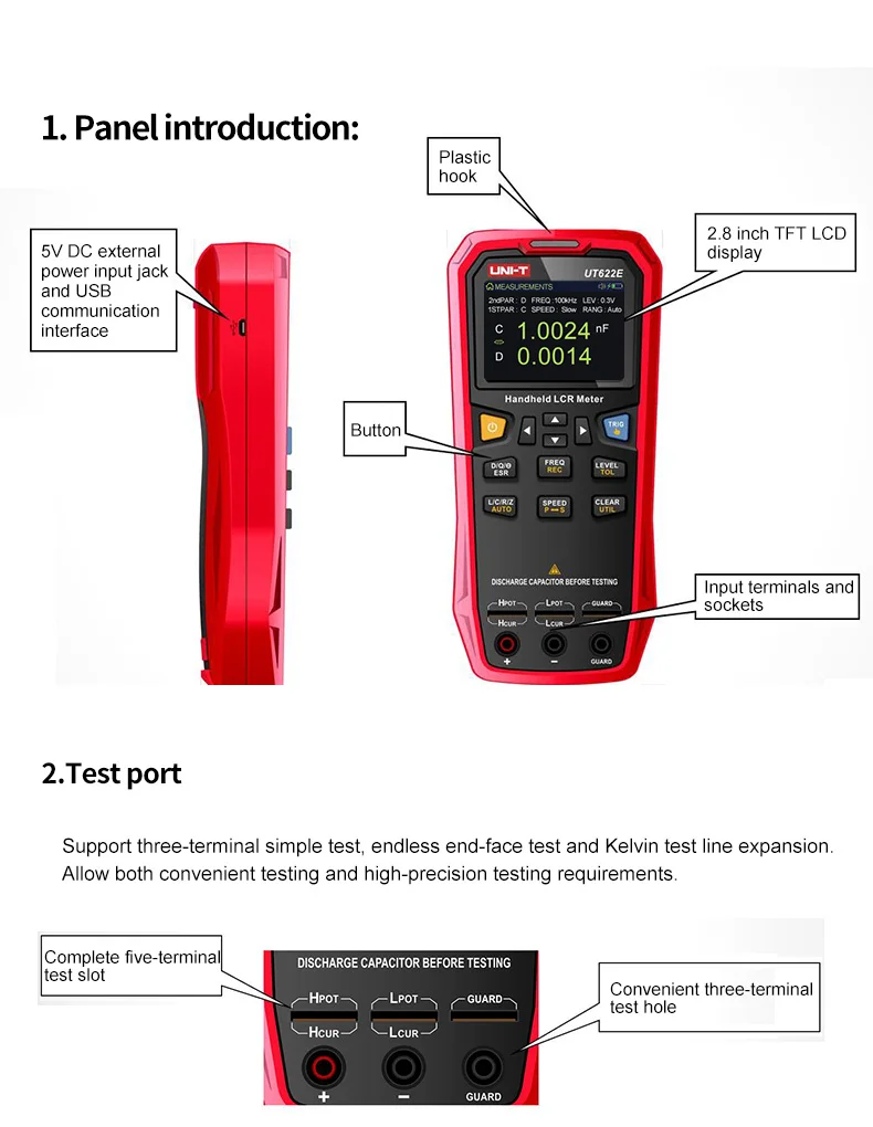 UT622 серия LCR digital bridge-это удобный ручной измерительный прибор для измерения индуктивности, емкости, сопротивления и других параметров компонентов. Он питается от li-ion 3,7 в 1800 мАч литий-полимерная батарея или внешний адаптер питания. Может использоваться в настольных приложениях. Частота, параметры и скорость прибора выбираются немедленно нажатием; В то же время он также имеет режим допуска для сортировки компонентов, и режим записи может помочь в получении показаний; простая в эксплуатации функция открытого замыкания и короткого замыкания Улучшает точность измерений; Практическое меню конфигурации можно установить фиксированный тон ключа, автоматическое выключение и другие операции.