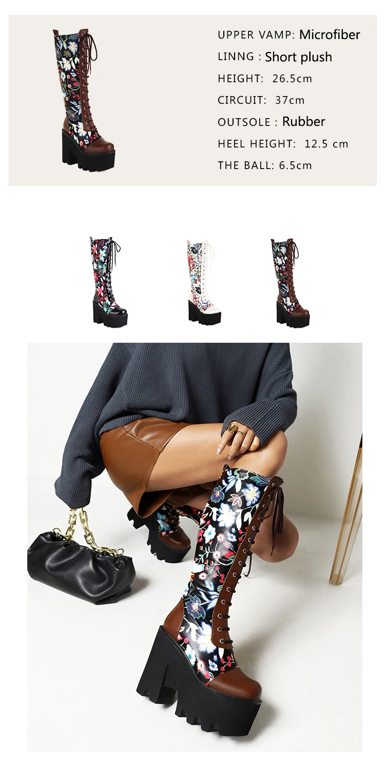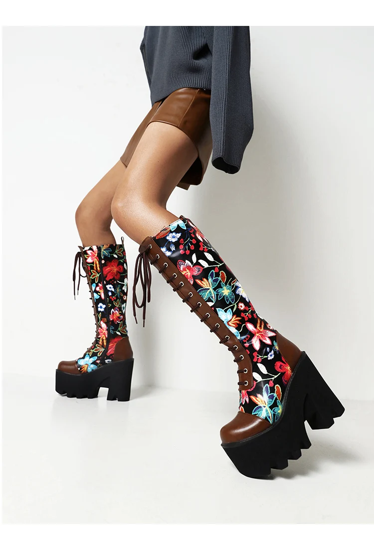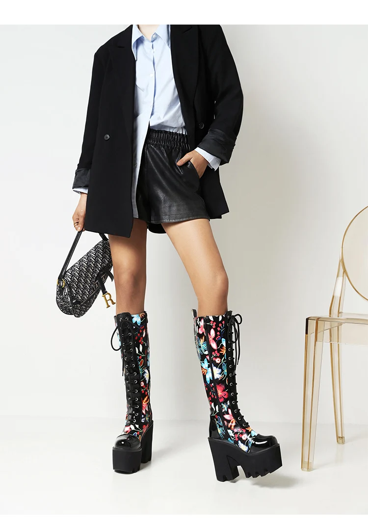 Женские сапоги до колена на толстой подошве в стиле панк, с квадратным носком, с цветочным узором и перекрестными ремешками ботинки на платформе на очень высоком каблуке один размер больше