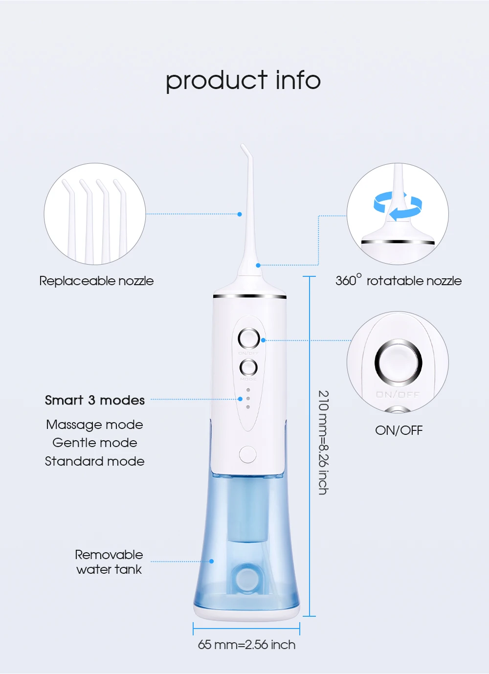 ● Сопло вращается на 360 градусов. Позволяет держать все-круглые, тупые промывки зубов во время чистки. Защита более Интимная.