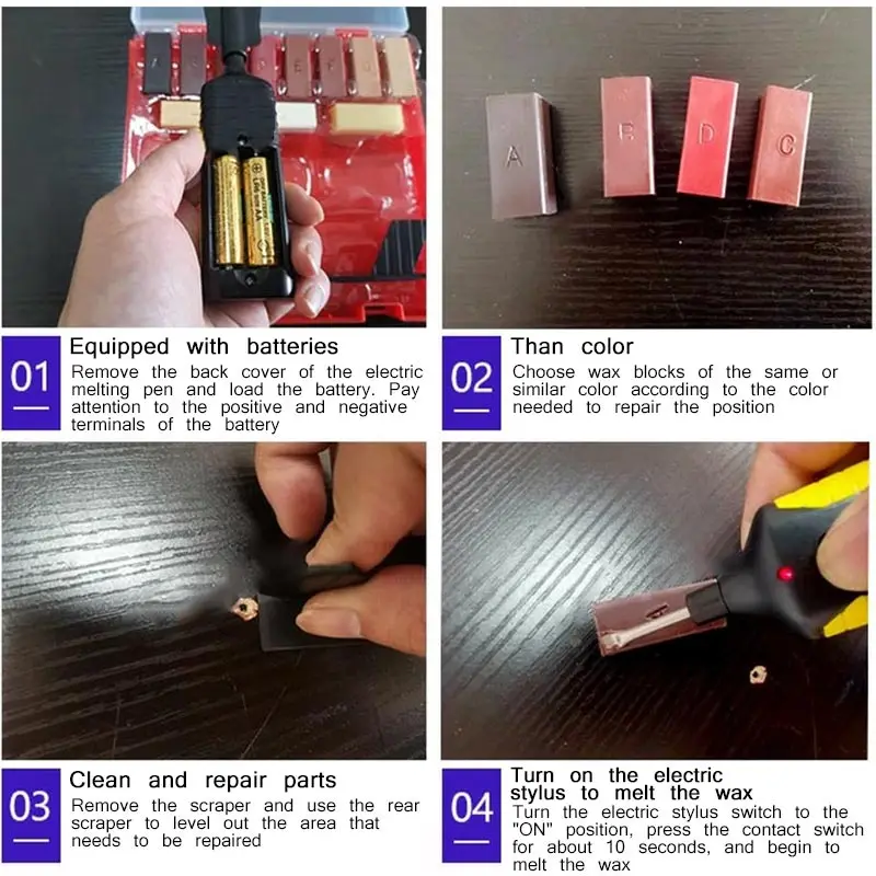 В комплект входит Универсальный ассортимент материалов, которые можно использовать для ремонта ламинатных полов и поверхностей в самых популярных цветах.