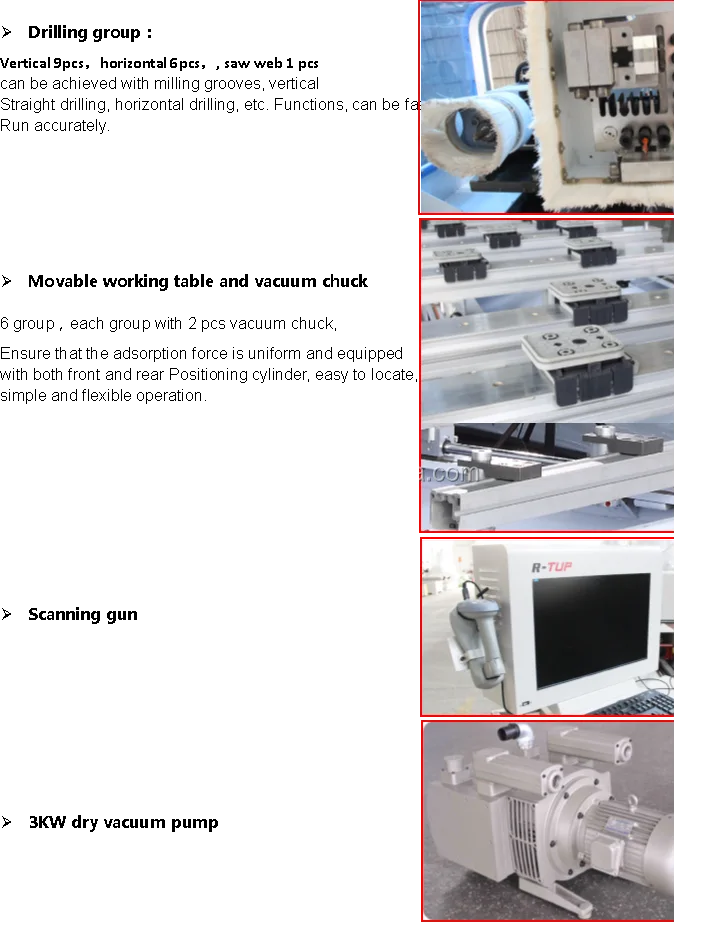 Описание товара Нет. Индекс машины Параметр 1. Рабочая ярость X rage 1200 мм Y rage 3300 мм 2. Минимальный размер пластины > 80 мм 3. Рабочий стол 1270*1550 мм подвижный стол 6 групп (каждая группа с 2 шт вакуумным патроном) 4. Точность машины Точность обработки ± 0,05 мм Повторное позиционирование ± 0,01 мм 5. Машинная структура Рабочий стол Подвижный Рабочий стол и Вакуумный патрон X,Y,Z Ось Y: Винтовая стойка; Ось XZ: шариковый винт 6. Скорость Движущаяся скорость оси Y 60 м/мин 7. Шпиндель Мощность шпинделя 6 кВт Вращающийся шпиндель 24000р/мин 8. Количество буровых рядов Вертикальная 9 шт., горизонтальная 6 шт., пила 1 шт. 9. Мощность 2HP 10. Скорость вращения 5400 об/мин 11. Рабочее напряжение AC380V/50 Гц 12. Система управления Компьютерная система управления syntec 13. Инструкция по эксплуатации G-код, *.NC 14. Размер машины 3300x4700x2000мм 15. Машина NW 2600 кг