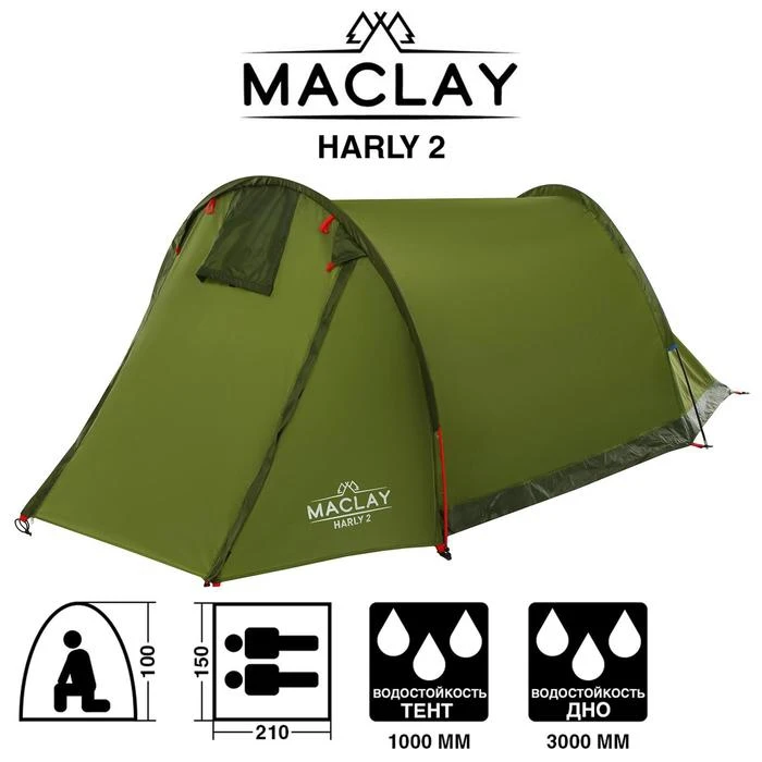 Палатка подходит для комфортного размещения 2 человек. Влагостойкость тента составляет 1000 мм водного столба, поэтому палатка защищает от влаги в условиях непродолжительных и моросящих дождей. При сильных или долгих ливнях тент может пропустить влагу.