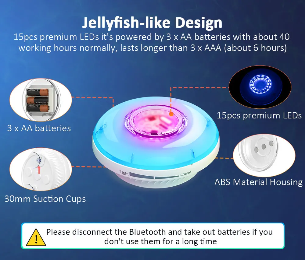 С этим уникальным дизайном корпуса, он выглядит замечательно, когда вы кладете его под воду. Этот подводный светильник для бассейна имеет светодиоды премиум класса 15 шт., освещение будет ярче, чем другой светодиодный светильник для бассейна s с всего 13 светодиодами. Он питается от 3 батареек АА с около 40 рабочих часов обычно, длится дольше, чем 3 х ААА (около 6 часов). Пожалуйста, отключите Bluetooth и выньте аккумуляторы, если вы не используете их в течение длительного времени.
