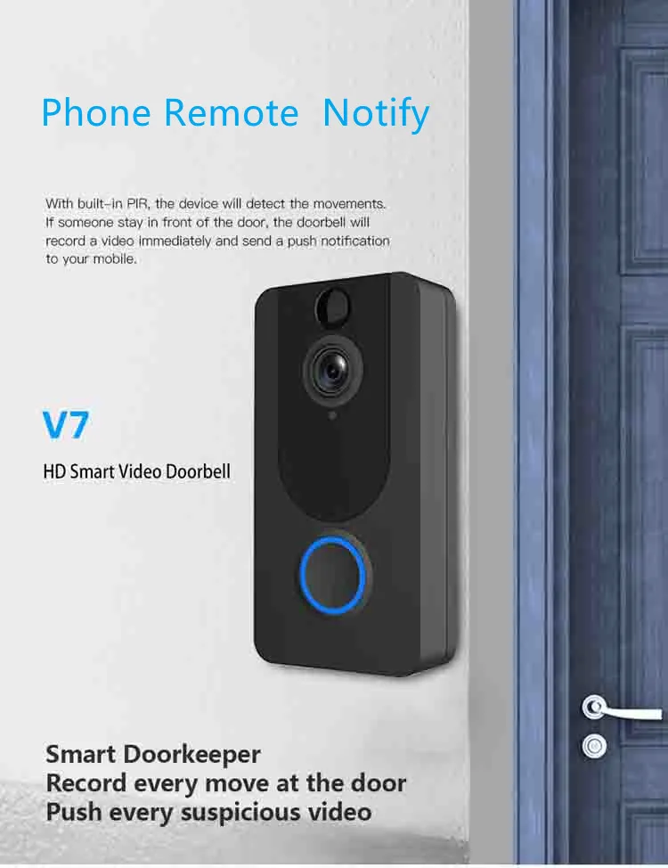 7: запись, запись обнаружения движения, кнопка дверного звонка для начала записи, предварительный просмотр приложения, запись действий посетителей.