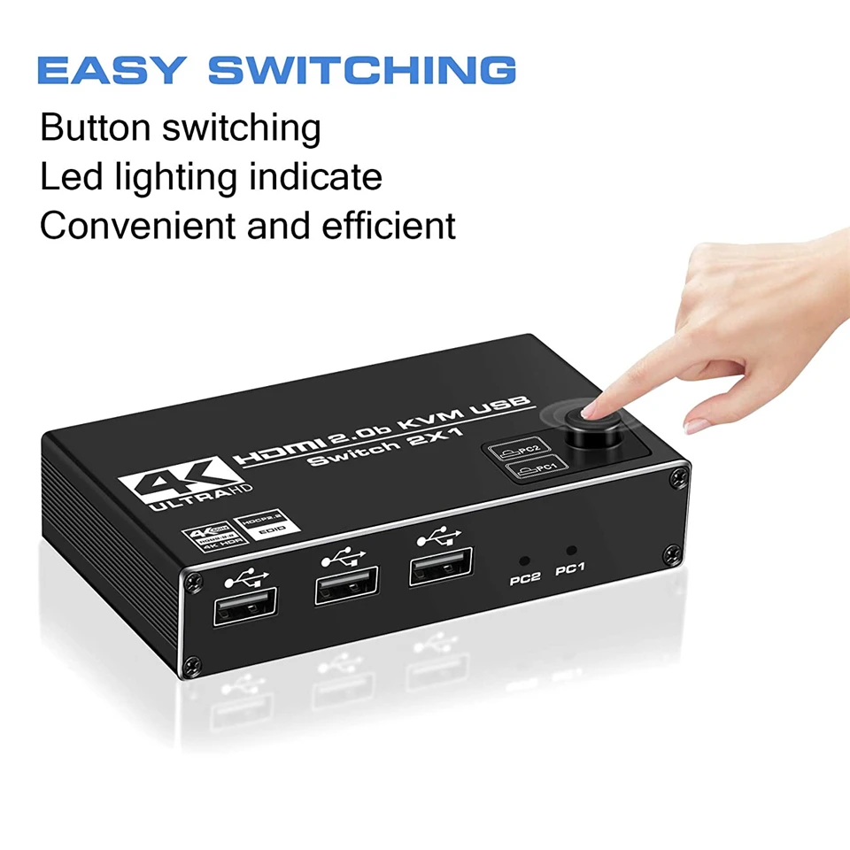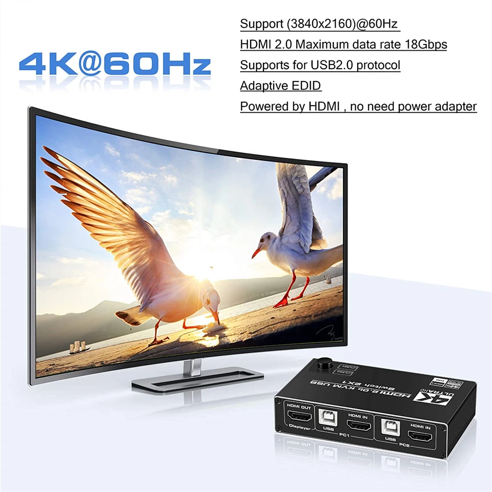 · HDMI 2.0b KVM USB переключатель: KVM переключатель позволяет управлять 2 компьютером с одним набором элементов управления (клавиатура и мышь) и экраном дисплея. Реализует синхронное переключение 2 в и 1 из свободного выбора. Вы можете централизованно управлять и управлять хостами ноутбука или игровой консоли без необходимости перемещаться с одной рабочей станции на другую.