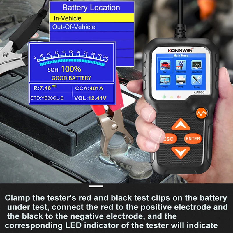 04. Тестер батарей KW681 может протестировать все свинцово-кислотные батареи для автомобилей, включая обычные свинцово-кислотные батареи, AGM плоские батареи, AGM спиральные батареи и гелевые батареи.