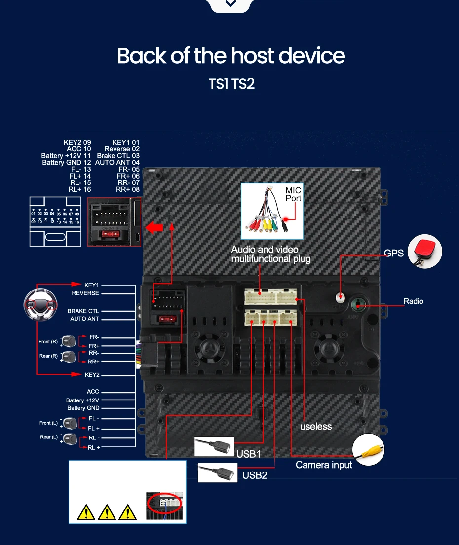 Один кабель RCA с внешним входом микрофона и кабелем управления усилителем, один кабель камеры заднего хода с Wi-Fi и Bluetooth сигнальными кабелями, один антенный кабель GPS, два usb-кабеля, один внешний микрофон в подарок