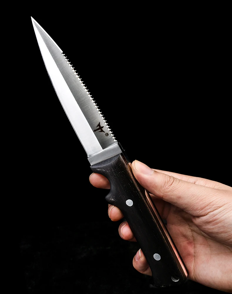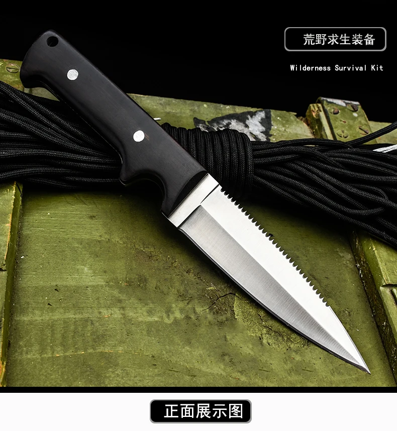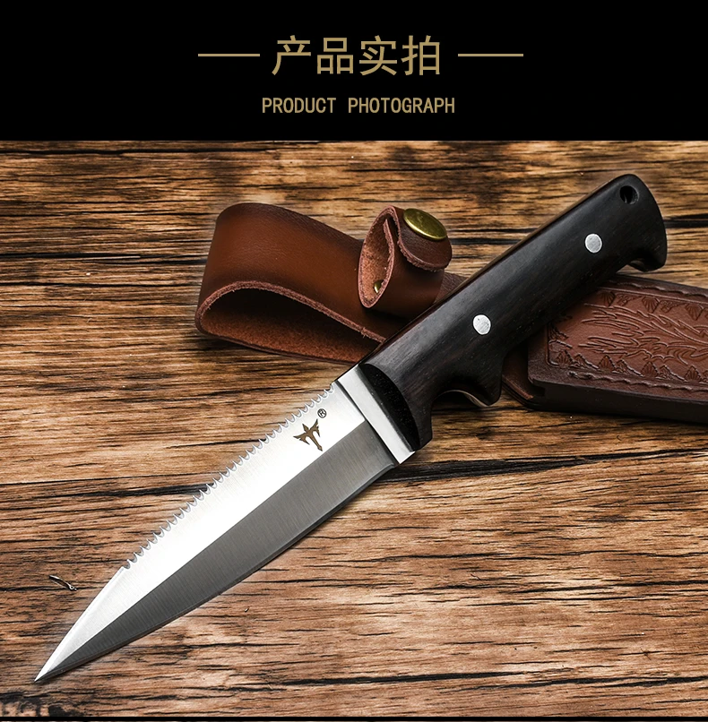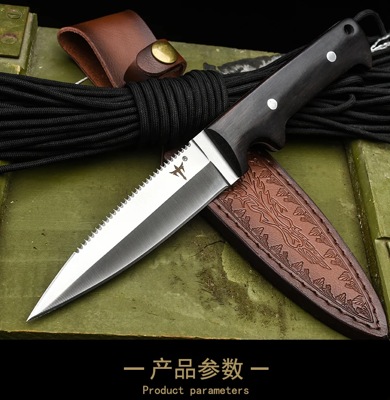 Полная длина: 22 смДлина лезвия: 9,9 смМатериал лезвия: 8cr13movМатериал ручки: деревоТвердость: 58-60HRCЧехол для ножа: кожаный чехол
