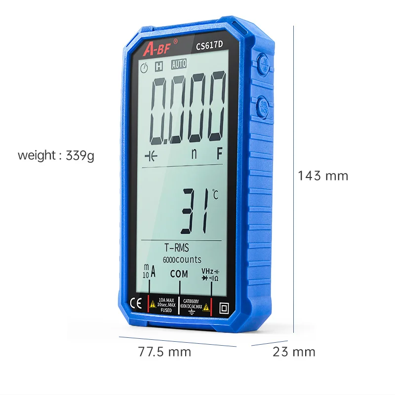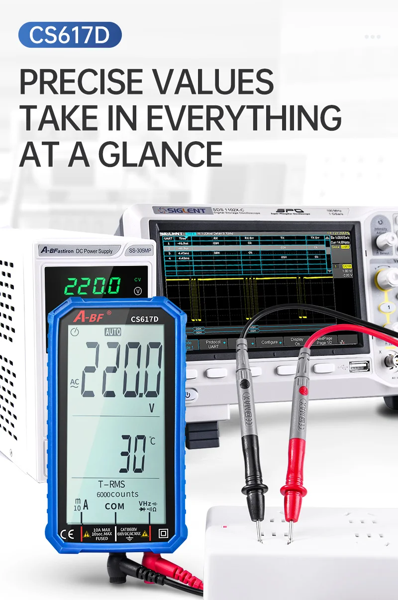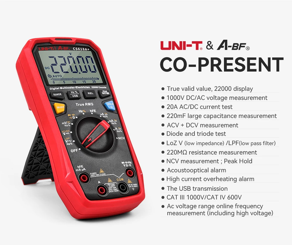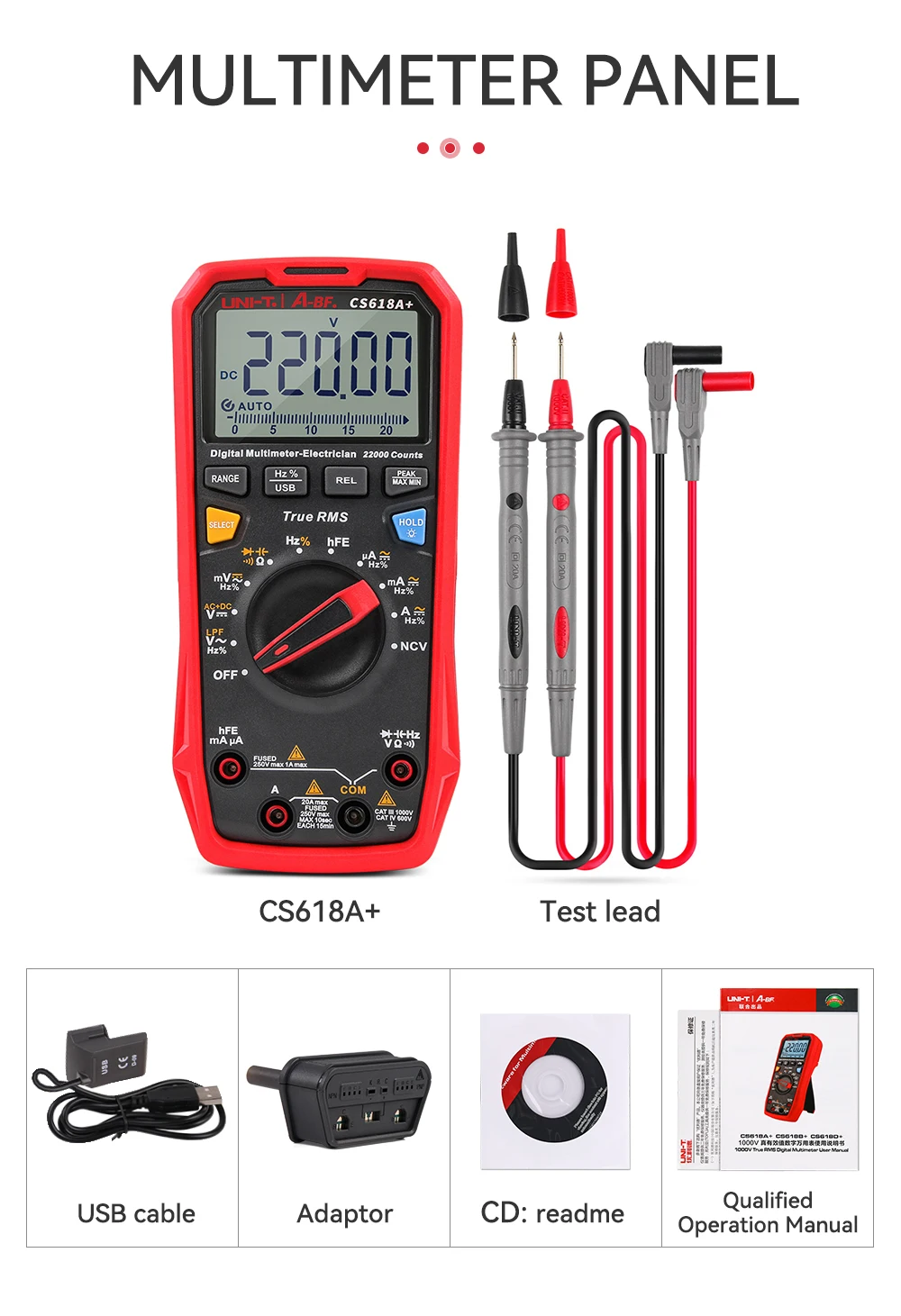 Надежный цифровой мульти-тестер 22000 отсчетов. Измеряет напряжение переменного/постоянного тока до 1000 В, ток переменного/постоянного тока до 20А, сопротивление, емкость, частота, рабочий цикл, пропускная способность, 46 аналоговых бар и т. д. Характеристики с ACV + DCV, hFE, LPF ACV, USB передачи данных.