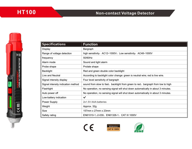 HT100P Бесконтактный 3 Индикатор чередования фаз переменного тока Напряжение Ручка